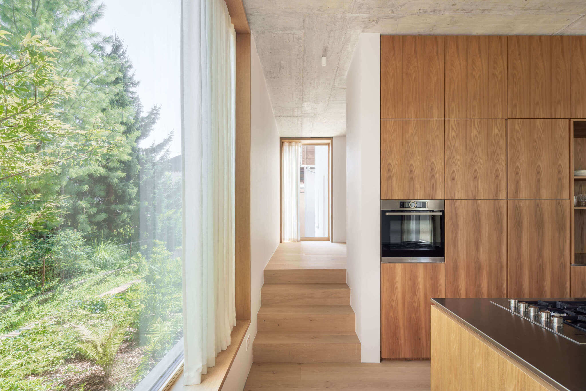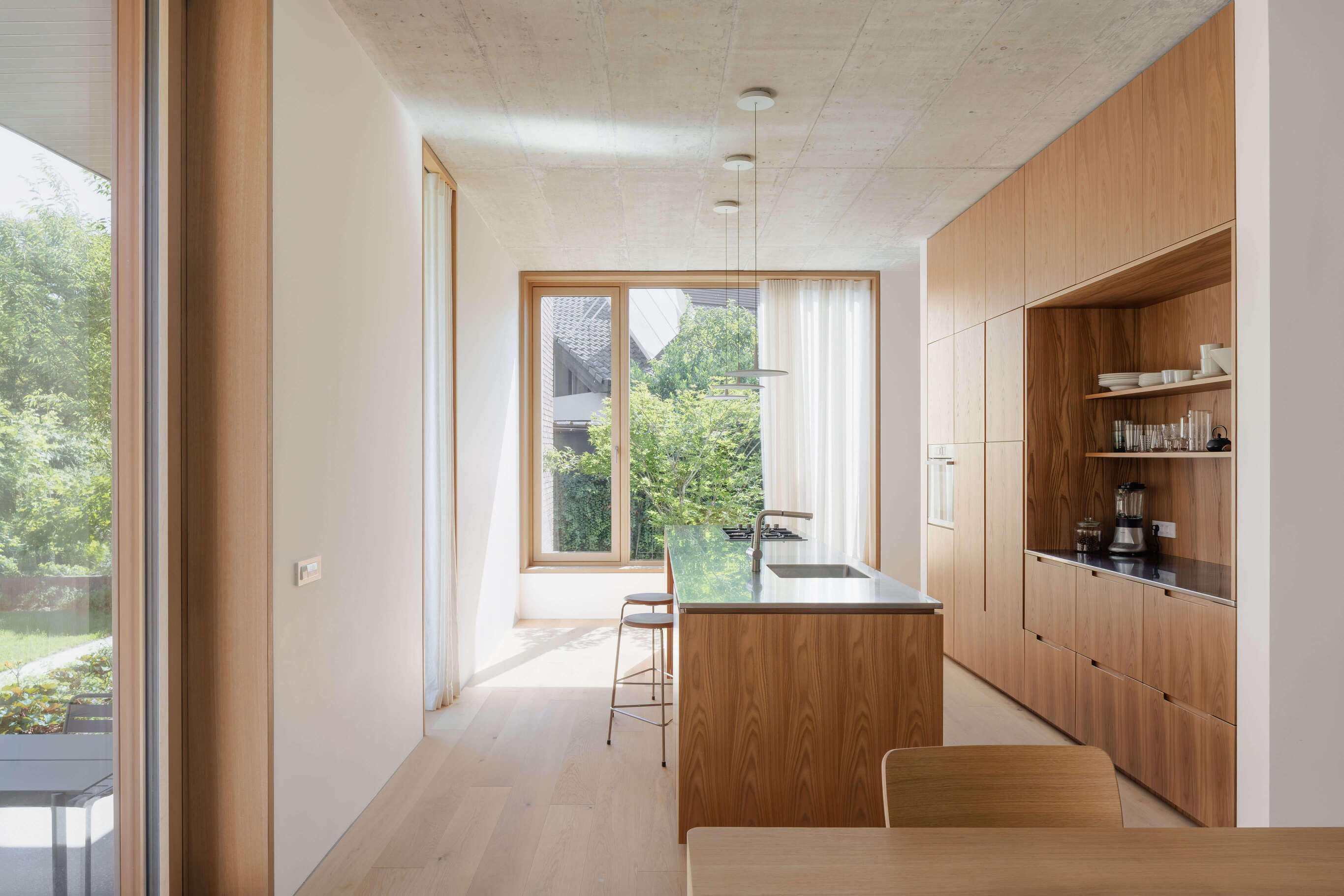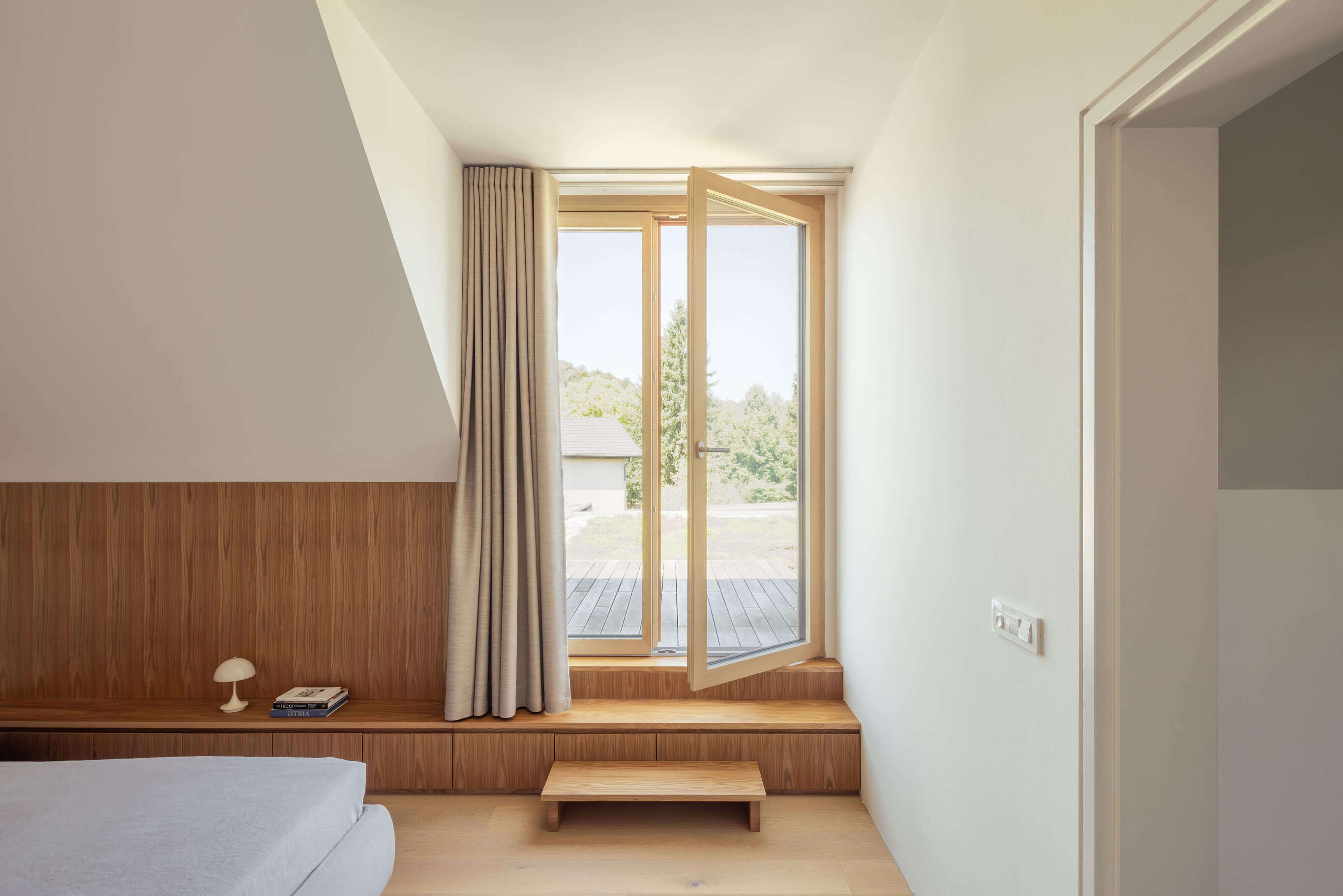 Materialna podoba je zadržana, a izrazna. Beton, les, steklo in bele stene ustvarjajo umirjeno ozadje, v katerem pridejo do izraza svetloba, prostorski prehodi in pogledi navzven. Kuhinja, jedilnica in dnevni prostor so povezani v enoten ambient, ki se z velikimi zasteklitvami odpira proti vrtu. V nadstropju so spalni prostori z izhodom na strešno teraso, od koder se pogled znova odpira v zelenje Rožne doline.