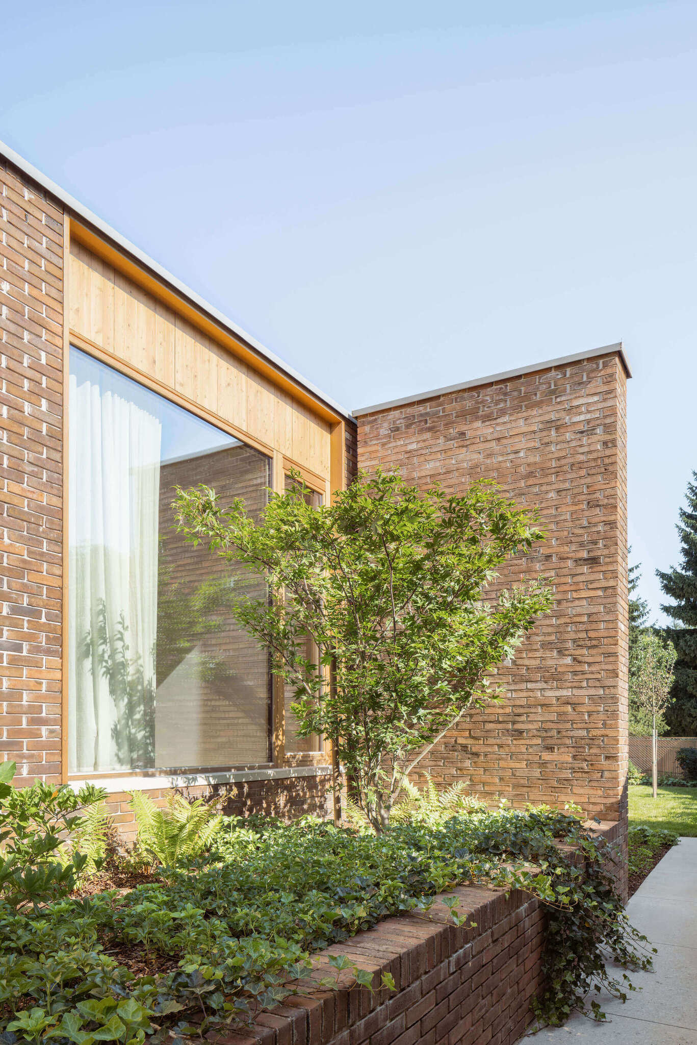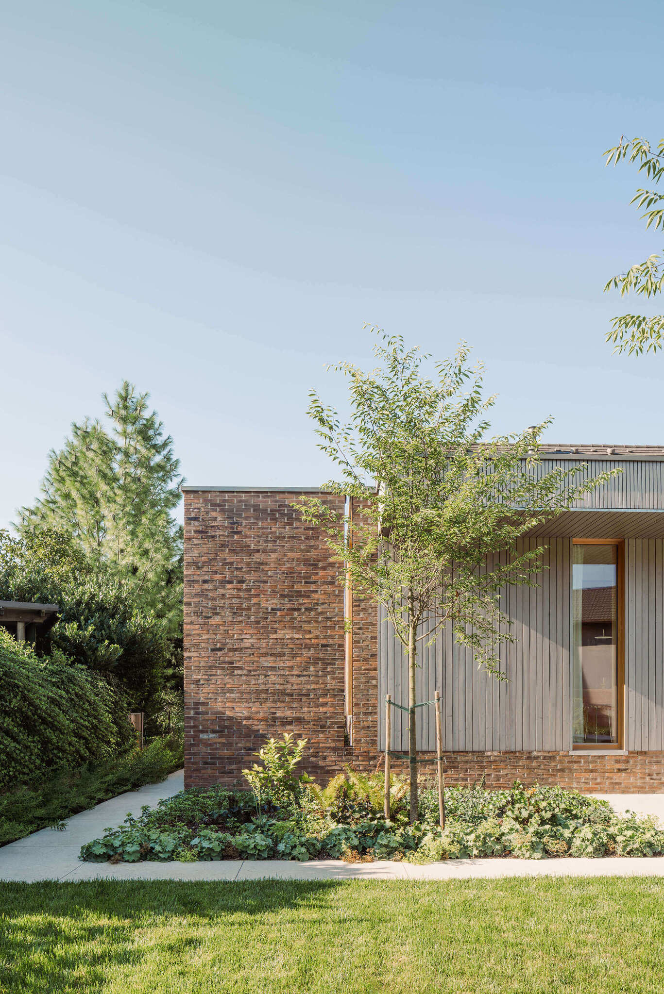 Opečni prizidek je pritličen in v celoti podrejen formatu izbrane opeke, ki postane osnovni konstrukcijski in oblikovni modul. Zidovi se podaljšujejo v vrt in brišejo jasno mejo med notranjim in zunanjim prostorom. Na mestih prekinitev zidov se pogledi, svetloba in prostori prepletajo, bivalni prostor pa se naravno razširi tudi na zunanjo teraso.
