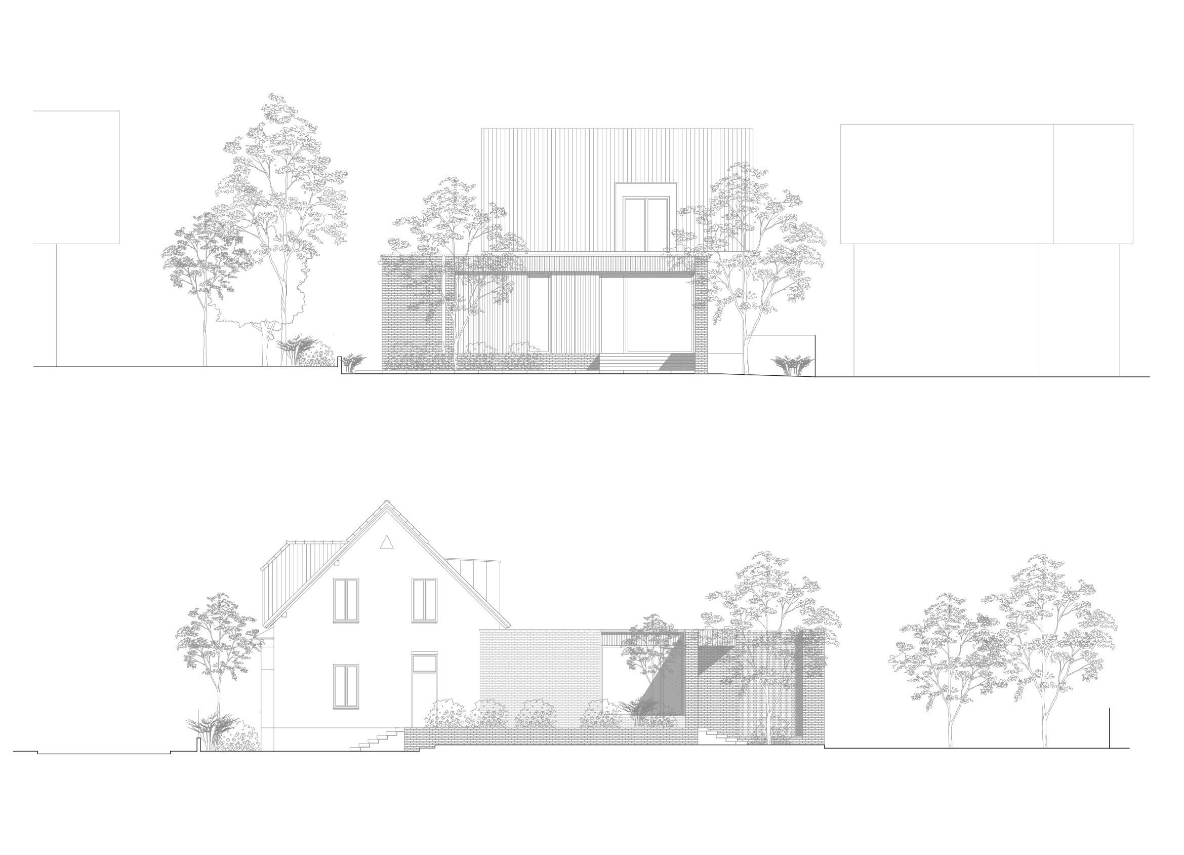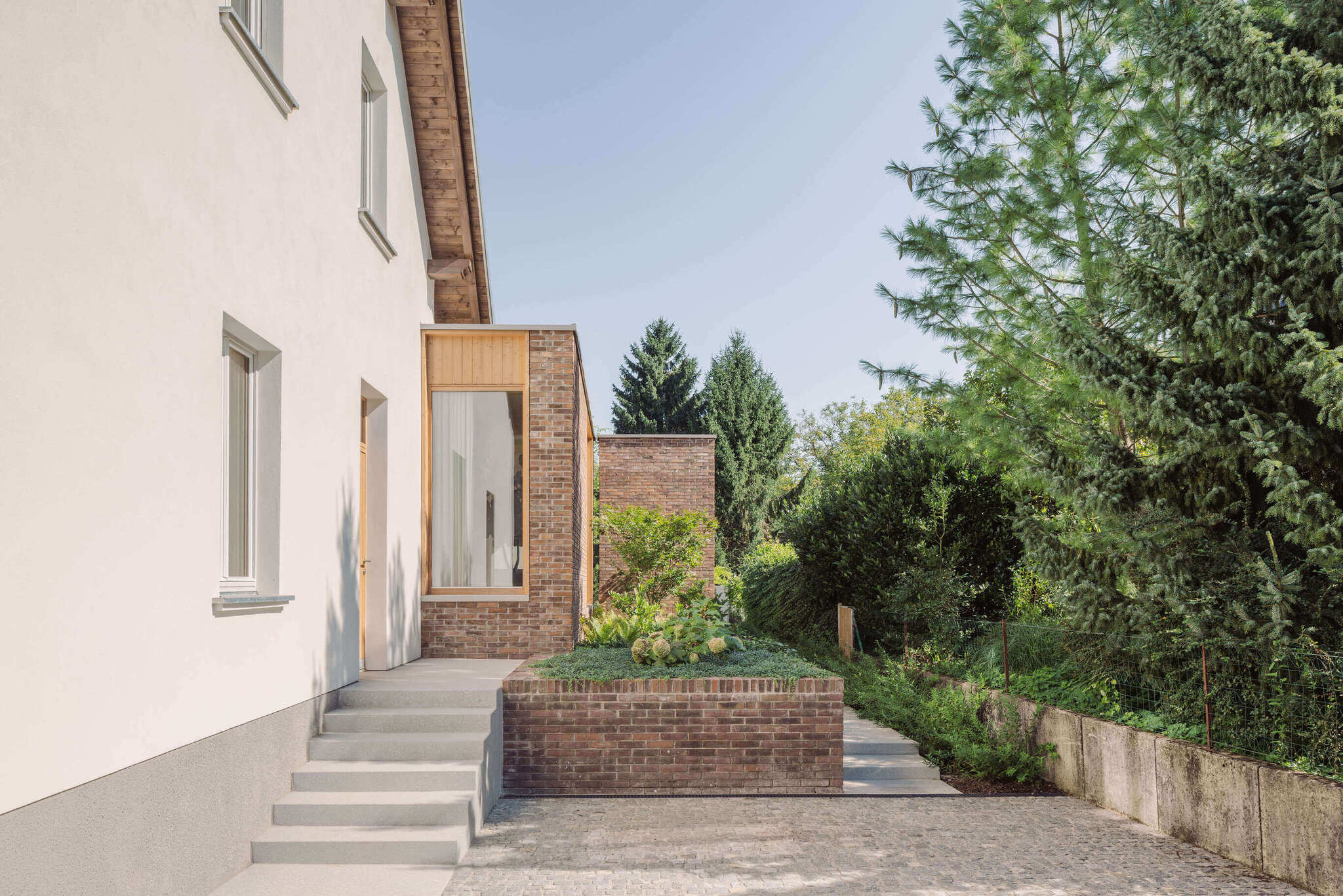 Zunanja podoba obstoječe hiše je bila oblikovno posodobljena z večjimi okni, nižjimi parapeti in tenkimi profili stavbnega pohištva. Nova okna ne posnemajo historičnega izvirnika, temveč iščejo sodoben, a zadržan izraz. Ulična fasada ostaja mirna in vpeta v niz sosednjih hiš, vrtna stran pa s sodobno opečno arhitekturo jasno razkrije, da gre za poseg našega časa. Hiša ima danes dva obraza – starega in novega – a deluje kot enovita celota. Med njima ne gre za tekmovanje, temveč za dialog med različnima obdobjema.