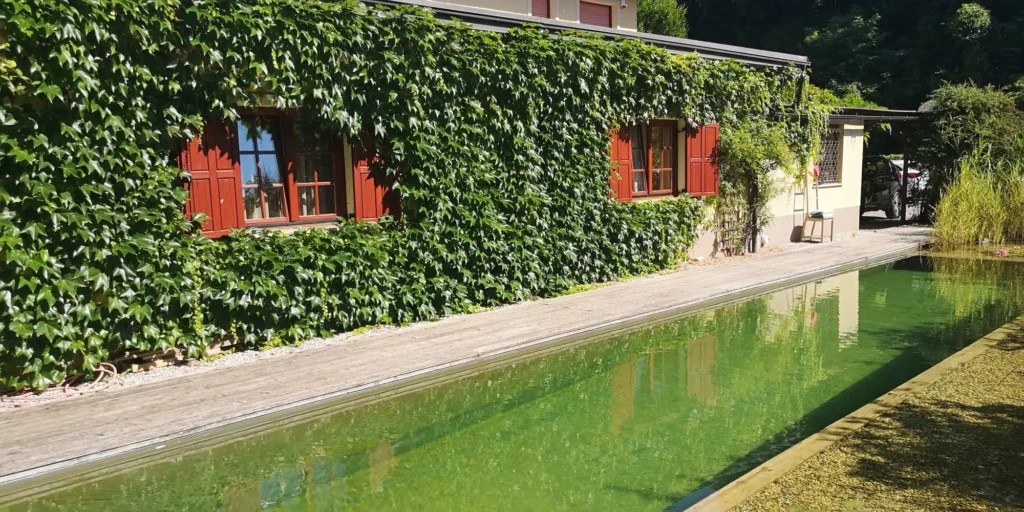 Če je vodni motiv na vrtu Alenke in Sama le ena od sestavin, pa ima voda na vrtu Marine Dermastia in Toma Turka glavno vlogo. Njun vrt na robu Ljubljane leži ob potoku, skrit med gostim drevjem. Iskala sta možnost, kako uresničiti željo po plavanju na domačem vrtu. Izbrala sta naravni plavalni ribnik ali bazen. Sestavljata ga del, namenjenega plavanju, in plitev del, posut s prodcem, v katerem so posajene različne vrste rastlin, ki uspevajo v vodi. Gospa Dermastia vsak dan plava v bazenu, obdanem z gostim zelenjem. Gospod Turk, priznani biolog, rad fotografira ptice, ki so redne gostje na njunem vrtu.