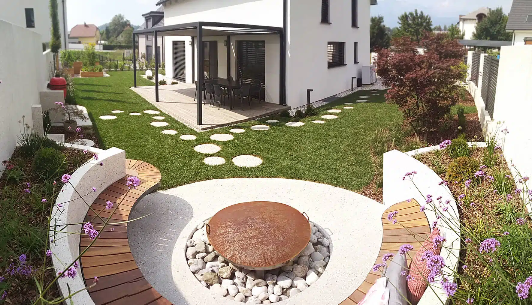 Večina vrtov pri nas nastane po zasnovi lastnikov, le majhen delež je strokovno načrtovanih vrtov. Med te spada vrt družine iz Kamnika, ki je za ureditev svojega vrta ob novi hiši poklicala krajinsko arhitektko Saro Peternel. Med željami lastnikov vrta je bilo tudi okroglo kurišče, okrog katerega je krajinarka postavila kamnito polkrožno klop, motiv kroga pa se ponovi na kamnitih pohodnih ploščah v trati, lučeh in okroglih prodnikih. Čeprav vrt ni prav velik, je Sara Peternel uspela vanj umestiti vse želje družine, ki na njem uživa tako podnevi kot ponoči.