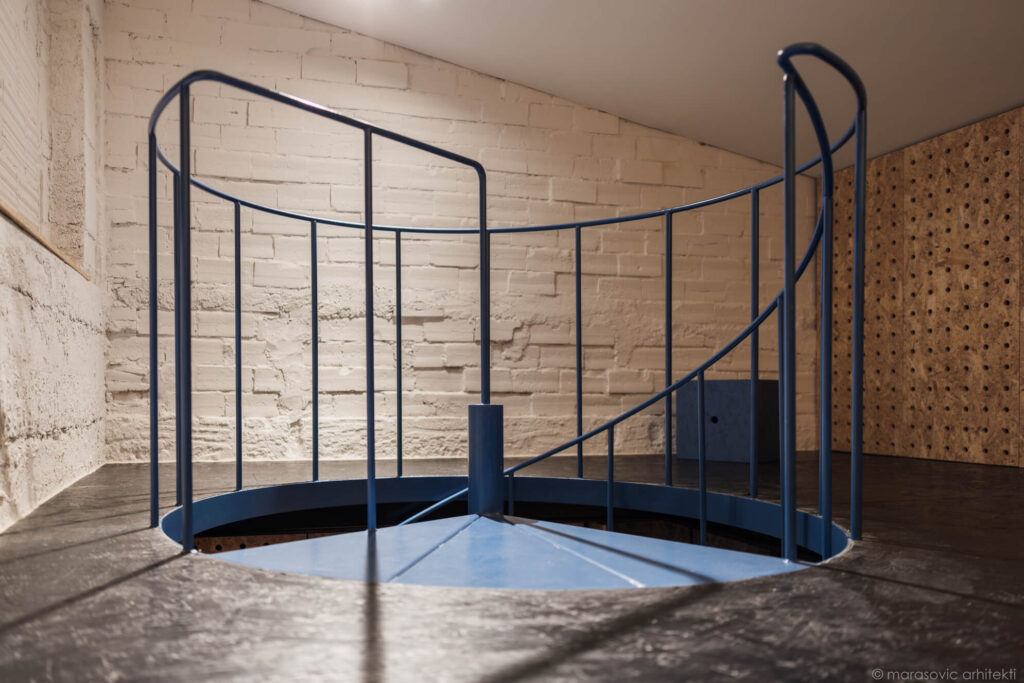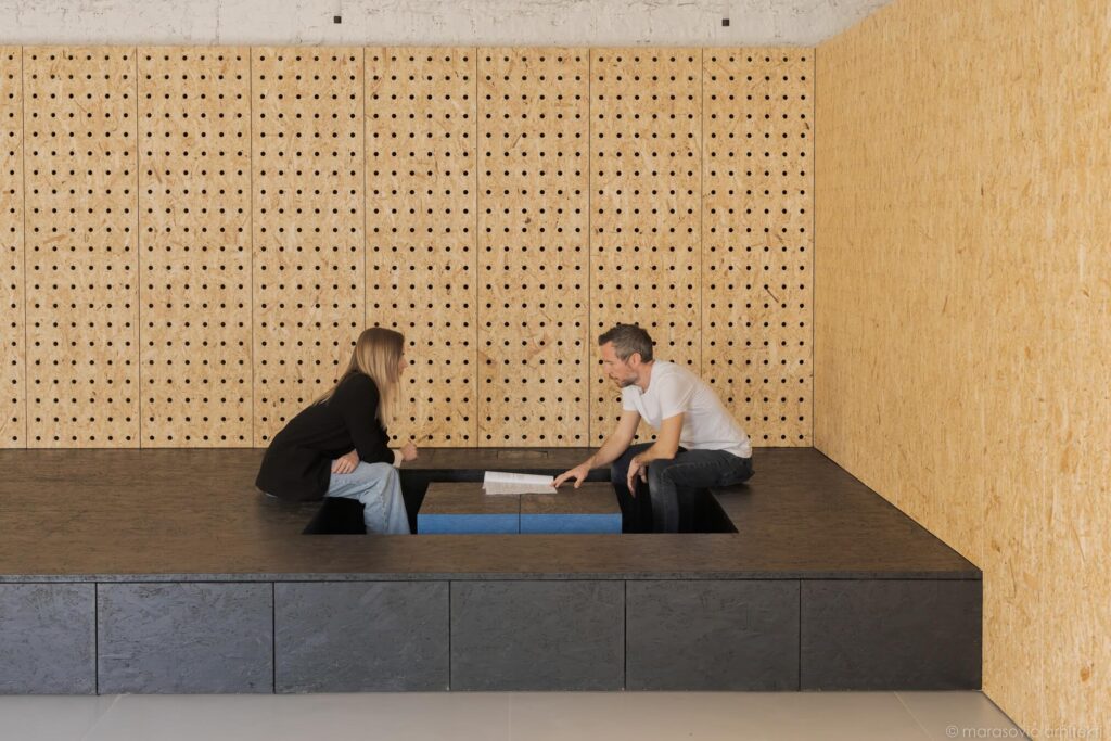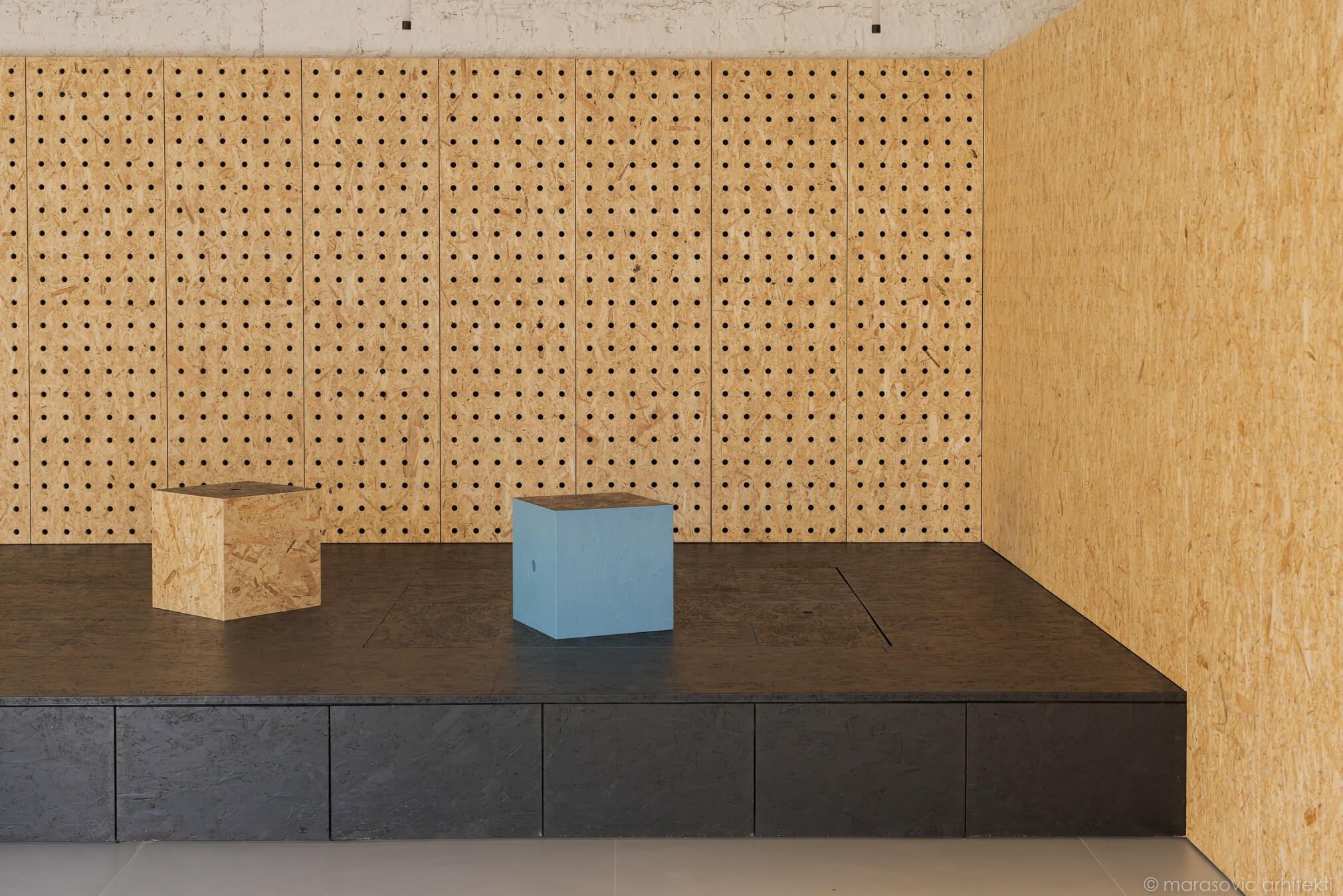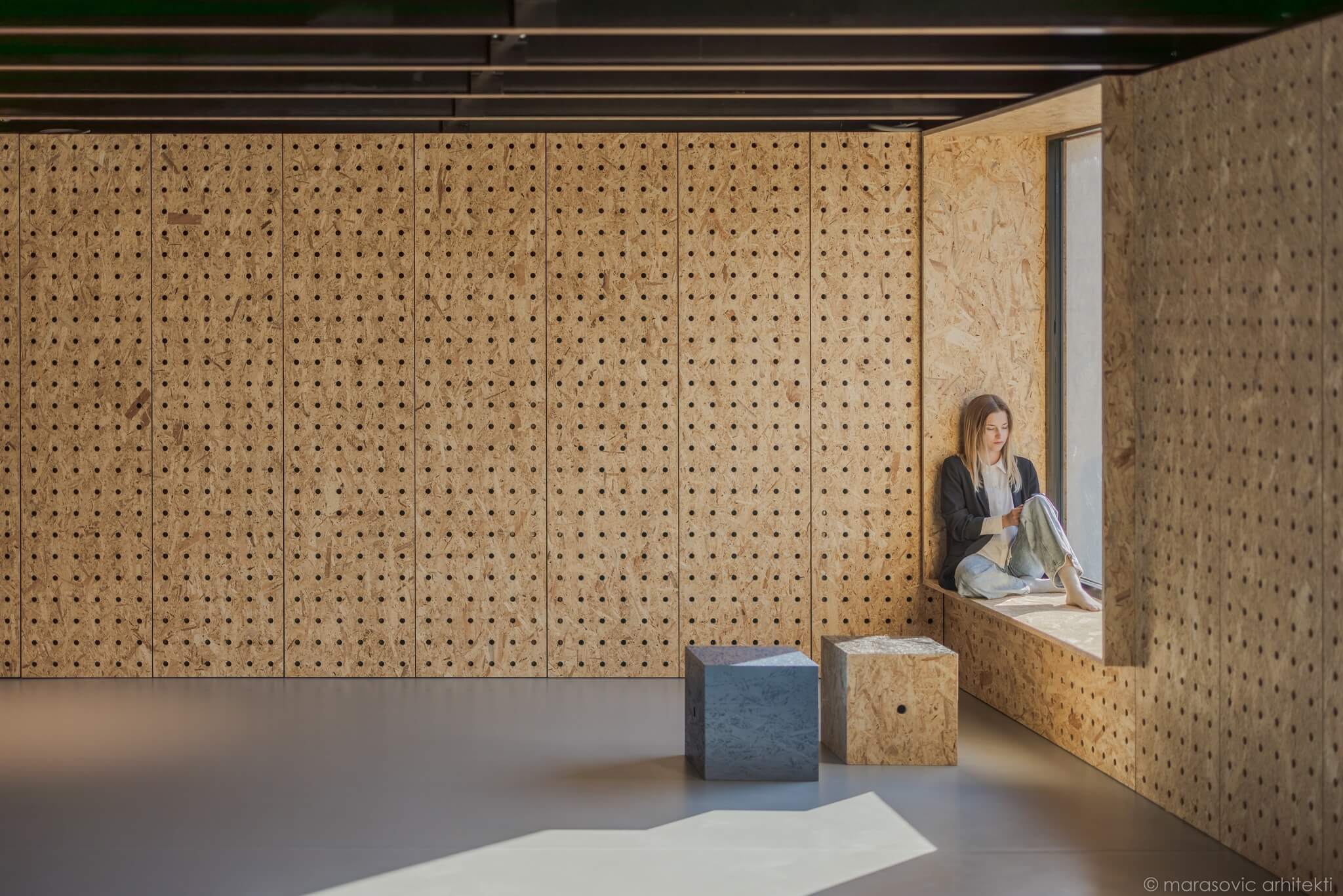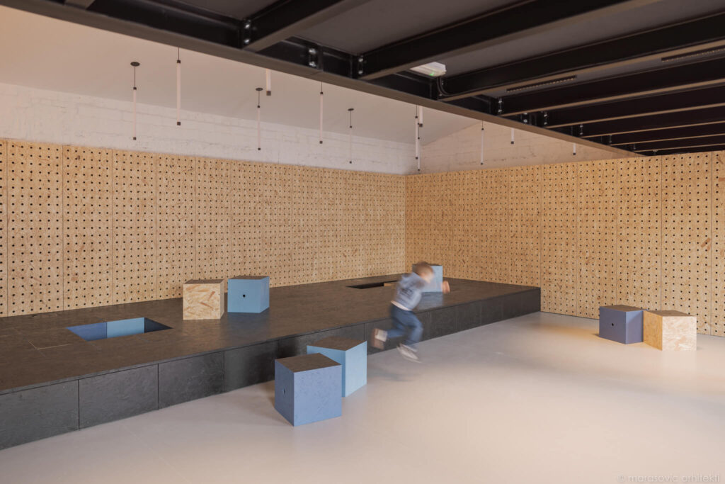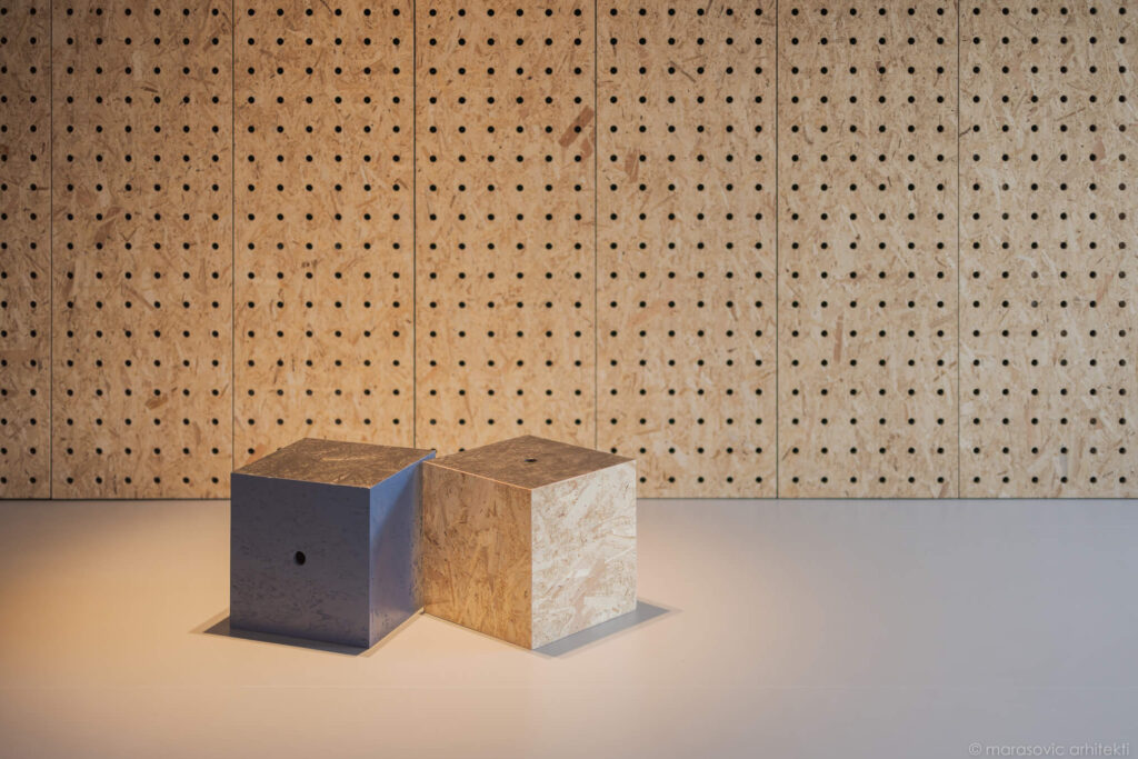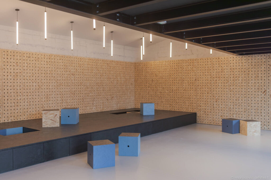 Prav oder daje prostoru poseben pečat – sestavljen je iz modularnih blokov, ki se lahko spreminjajo v mize, sedišča ali skladiščne enote. Takšna ureditev omogoča, da prostor diha s potrebami uporabnikov: danes oder za koncert, jutri niz taburejev za popoldansko druženje. In to brez dodatnega pohištva, ki bi prenasičilo prostor ali zahtevalo dodatno skladišče v času koncertov.