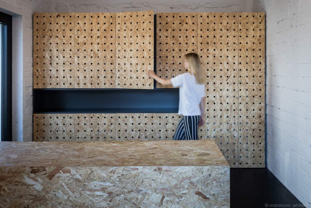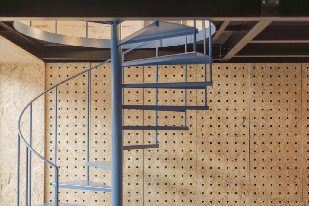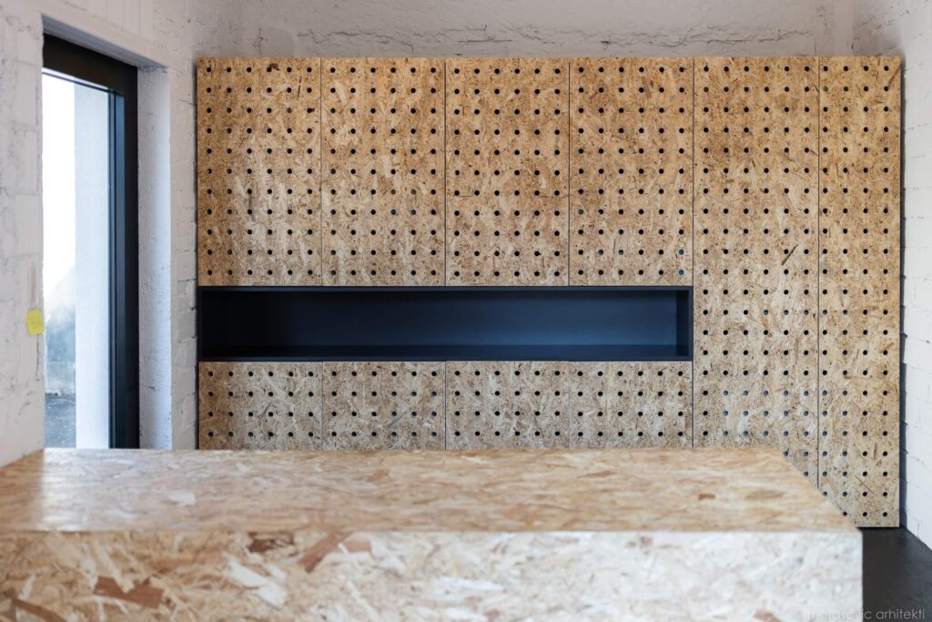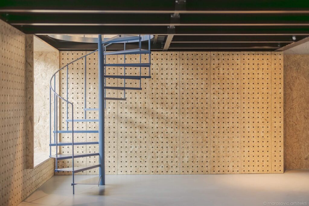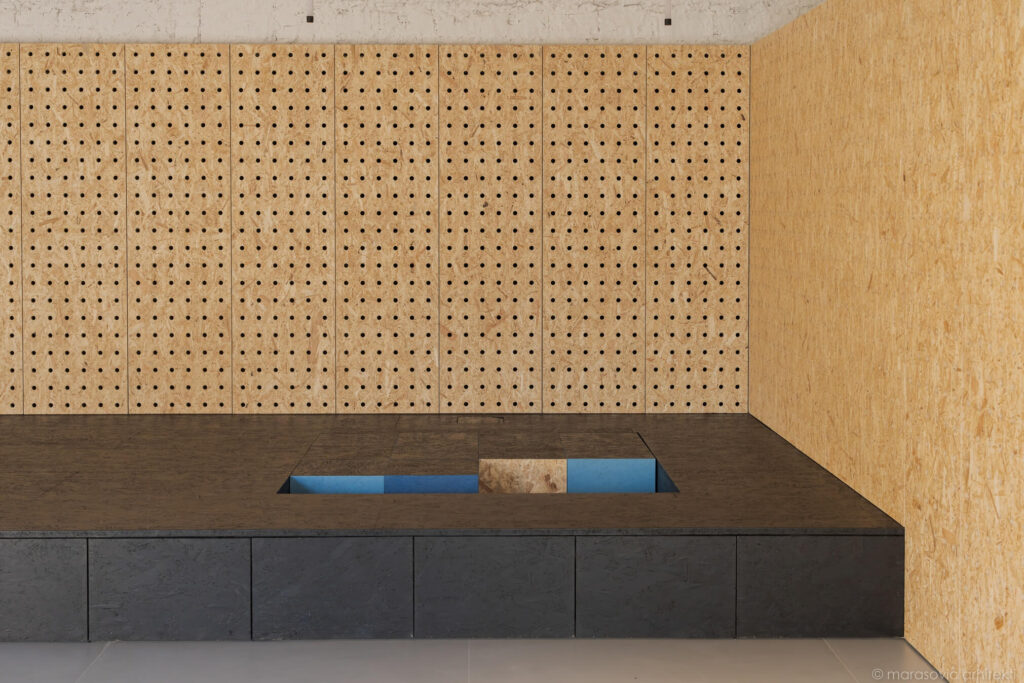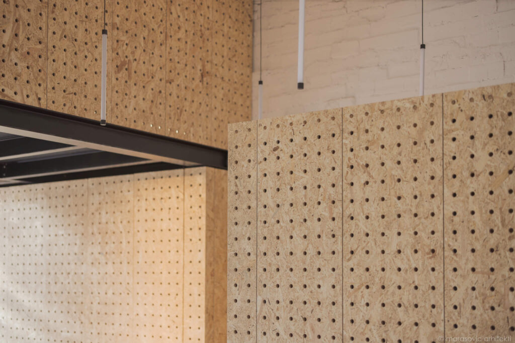 Materialna zasnova je zavestno preprosta. OSB-plošče, iz katerih so izdelane omare in stenske obloge, oblikujejo toplo, enotno ozadje, občasno poudarjeno z barvami vizualne identitete kluba ter razgibano s subtilno teksturo perforacij. Ustvarjajo enovit ovoj, za katerega so arhitekti uspešno skrili tehnične prostore, kuhinjo in shranjevalne površine, pa tudi nadgradne inštalacije, ki so omogočile cenovno dostopnejšo prenovo.
