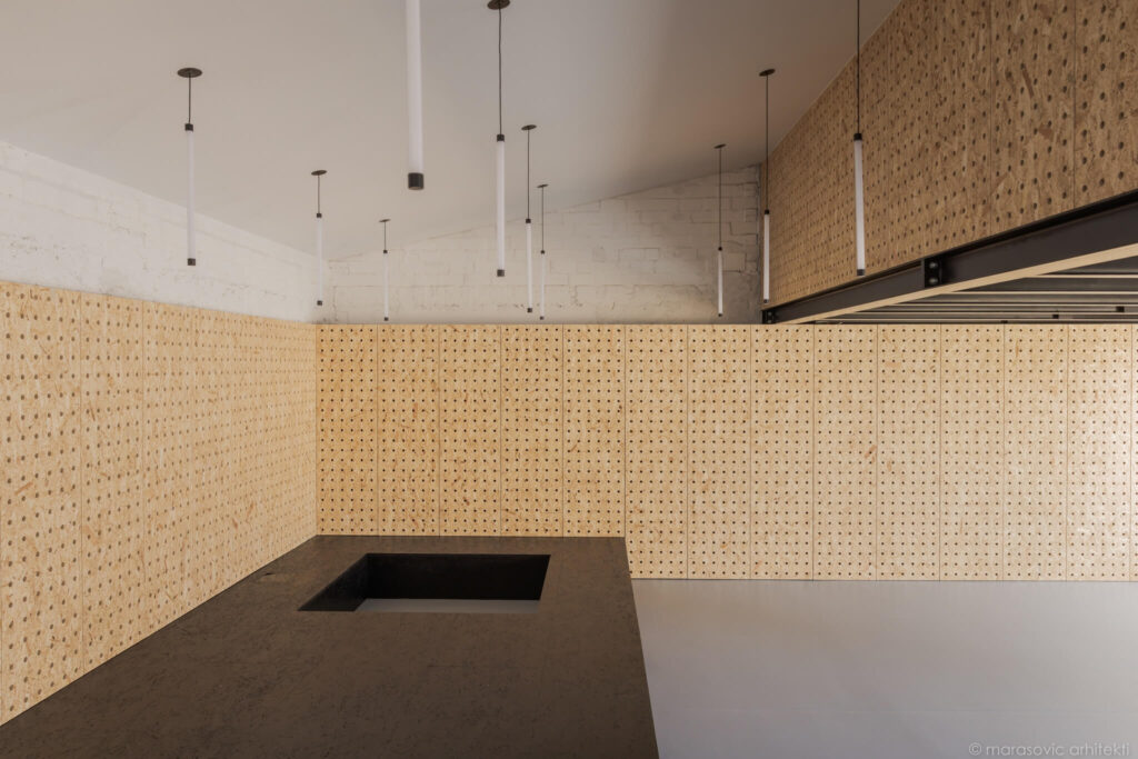 Rdeča nit prostora je svetloba. Viseča svetila nad platformo mehčajo neenakomerno višino stropa in skupaj s tehnično osvetlitvijo omogočajo različne scenarije – od vsakodnevne rabe do odra, ki oživi ob večernih dogodkih.