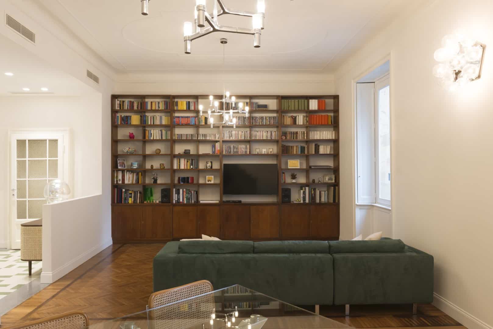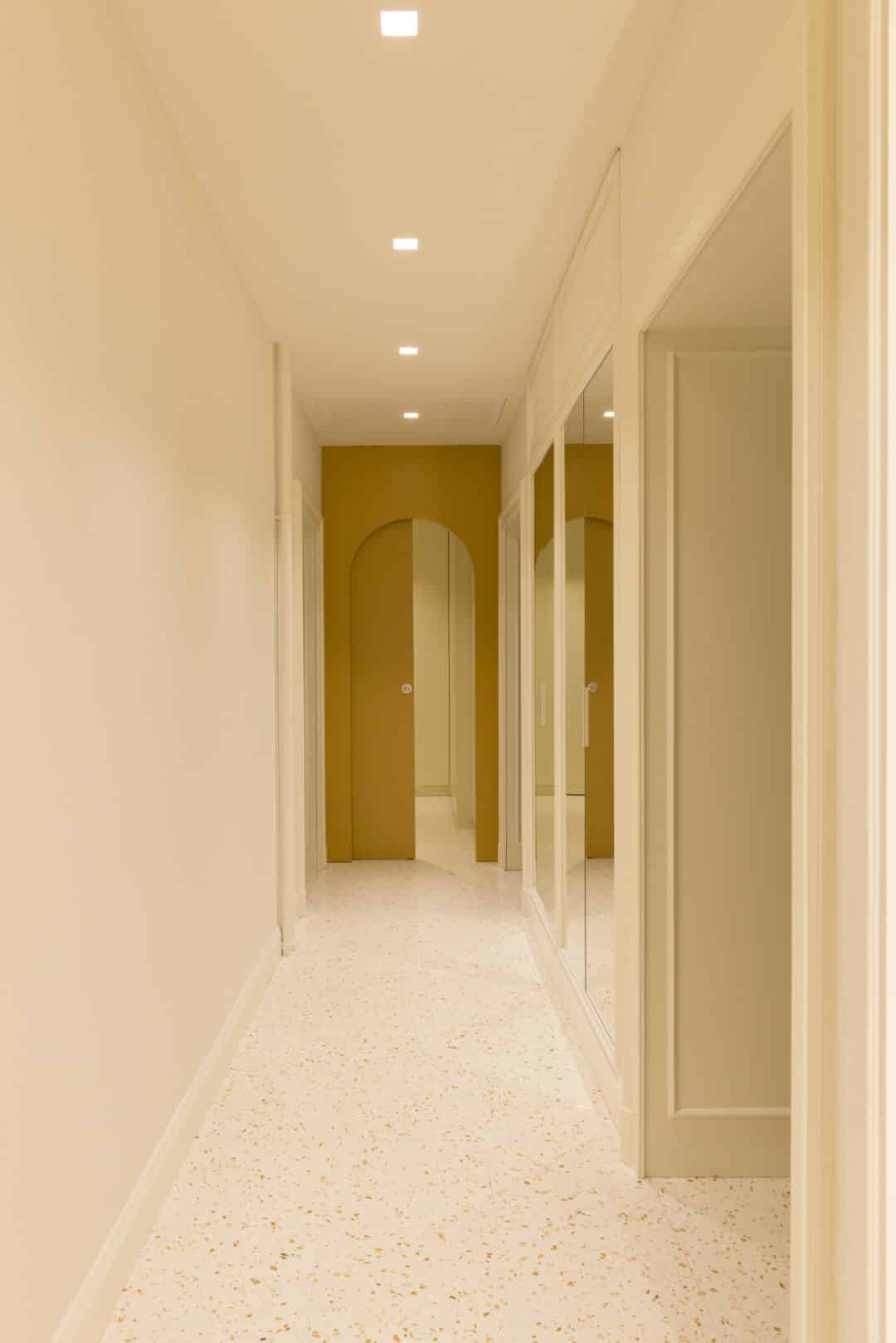 Stanovanje je sicer prostorno, na kar se je naslonila tudi arhitektka Simona Alù. V beline polno stanovanje pa je vdahnila tudi pridih gledališke kulise ter ga tako naredila za odtenek bolj dramatičnega. Površina 170 kvadratnih metrov velikega stanovanja je razdeljena v dve etaži. Obe enoti je povezala z linearnim stopniščem, ki je nasproti od vhoda in deluje kot gledališka kulisa. Terrazzo se s pritličja nadaljuje po stopnicah, kar ustvarja kontinuiteto med nivojema. Ustvarila je stopnišče s sodobnim značajem, ki kot umetniška skulptura ostaja v dialogu s slogom in zgodovino stavbe.