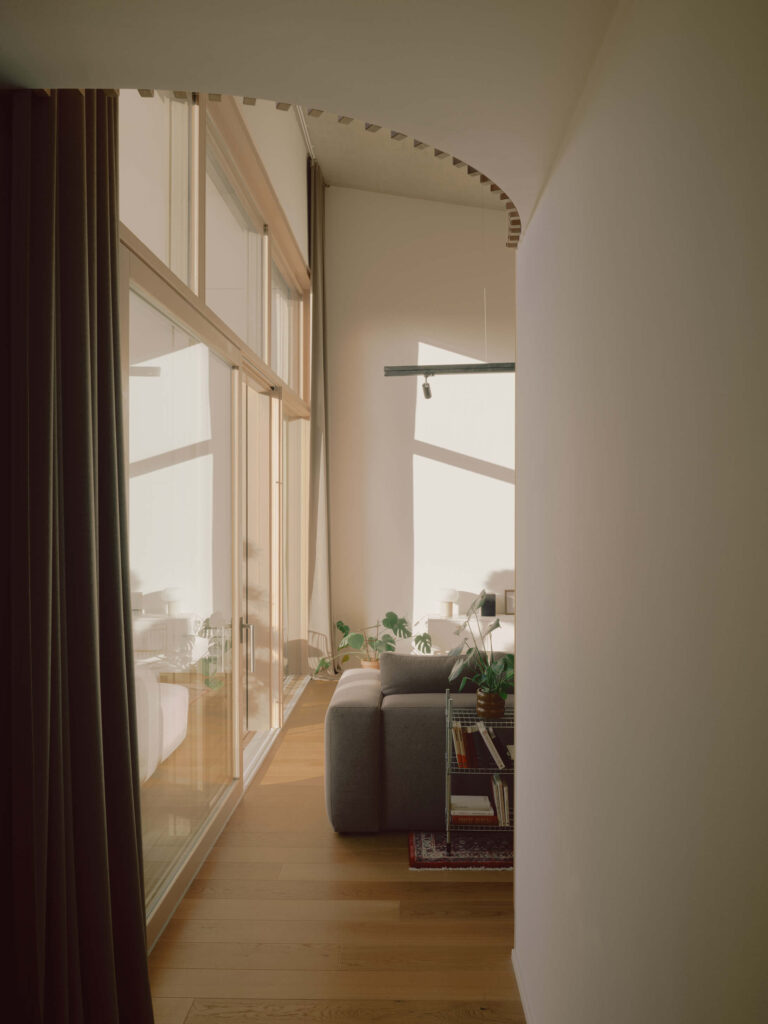 Velik, visok in dolg prostor je predstavljal izziv, kako vanj smotrno umestiti vse potrebne prostore za udobno bivanje. Pomagala sta si tako, da sta tloris razdelila v tri glavne pasove. Prvi je ob vhodu in vključuje manjšo kopalnico in utiliti. Drugi pas predstavlja osrednji dnevni prostor. V tretjem pa so spalni prostori s kopalnico, otroško sobo in galerijo nad njimi.