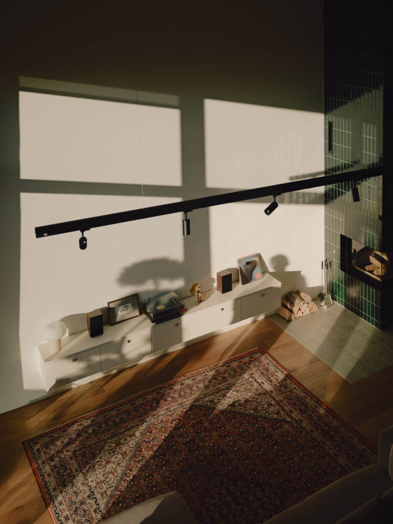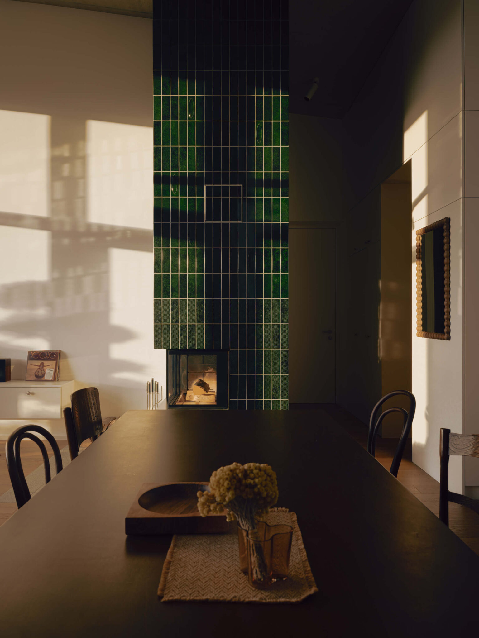 Tako zaradi velikosti kot zaradi svetleče, barvite obloge pritegne pogled velik kamin. Namesto da bi ga oblekli v klasične keramične pečnice, so izbrali manjše keramične ploščice, ki ustvarjajo izrazito teksturo in ogrevalni element povezujejo s sodobnim videzom stanovanja.
