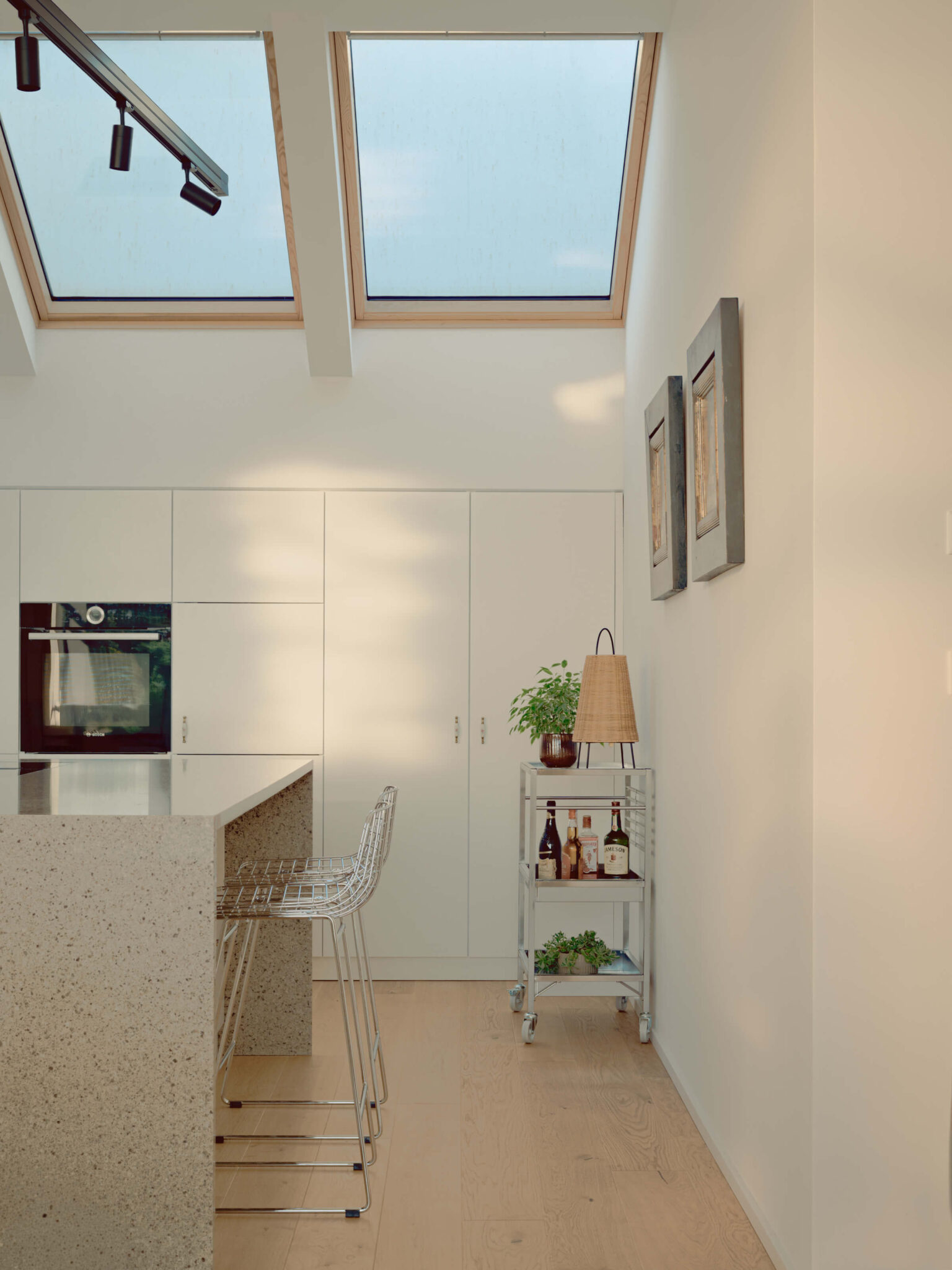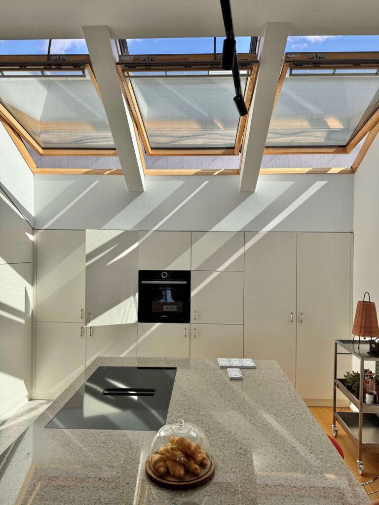 »Globina prostora je velika, dobrih 11 m. Kljub visokemu stropu in s tem visokim fasadnim oknom zadovoljiva količina svetlobe ne bo prišla v prostor več kot do polovice, zato se s kombinacijo treh strešnih oken na nasprotni strani, uravnoteži osvetlitev globokega prostora s potrebno količino dnevne svetlobe. Velika površina kombinacije treh strešnih oken se razprostira po celotni širini kuhinjskega prostora, zato priprava hrane postane še večji užitek, saj je delovni pult stičišče druženja,« pove Neža Močnik, arhitektka pri podjetju VELUX Slovenija in doda, da so okna elektrificirana z možnostjo upravljanja na daljavo. Omogočajo preprosto neposredno odvajanje vonjav, zato niti ni bilo potreb po vgrajevanju kuhinjske nape, poleg tega zunanja mrežasta senčila preprečujejo pregrevanje zaradi vzhodnega sonca v poletnih mesecih, prav tako preprečujejo bleščanje na pultu.