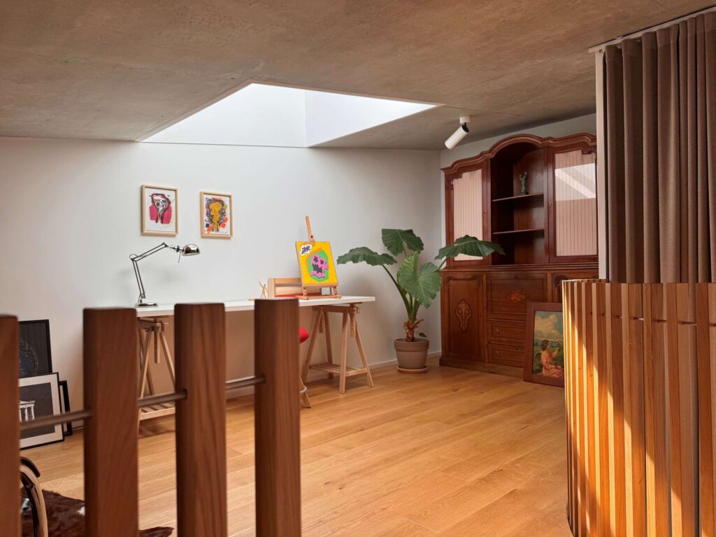 Stanovanje, ki meri okoli 120 kvadratnih metrov, je bilo pred začetkom preureditve v tretji podaljšani gradbeni fazi, torej so bili izdelani notranja konstrukcija, prav tako tudi streha in stavbno pohištvo. V tlorisu pa so bila dopustna določena odstopanja, kar je arhitektoma omogočilo uresničitev njunih zamisli; naročnik preureditve je namreč želel, da bi povečali dnevni prostor in izkoristili izredno višino stanovanja. Tako je nastala galerija v mansardi.