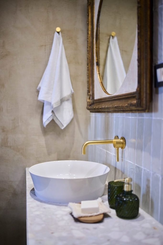 Pri oblikovanju notranjosti si je lastnik želel, da bi tudi stene odražale edinstven značaj prostora. Skupaj s pleskarjem sta razvila inovativno tehniko: na površino sta z lopatico najprej nanesla lepilo za ploščice, nato pa z gobico postopoma dodajala zlato-rjave odtenke. Končni videz so stene dosegle z natančnim glajenjem, ki je ustvarilo harmonično teksturo, zaradi katere izžarevajo toplino in prefinjenost, hkrati pa subtilno dopolnjujejo preostale elemente notranje opreme.