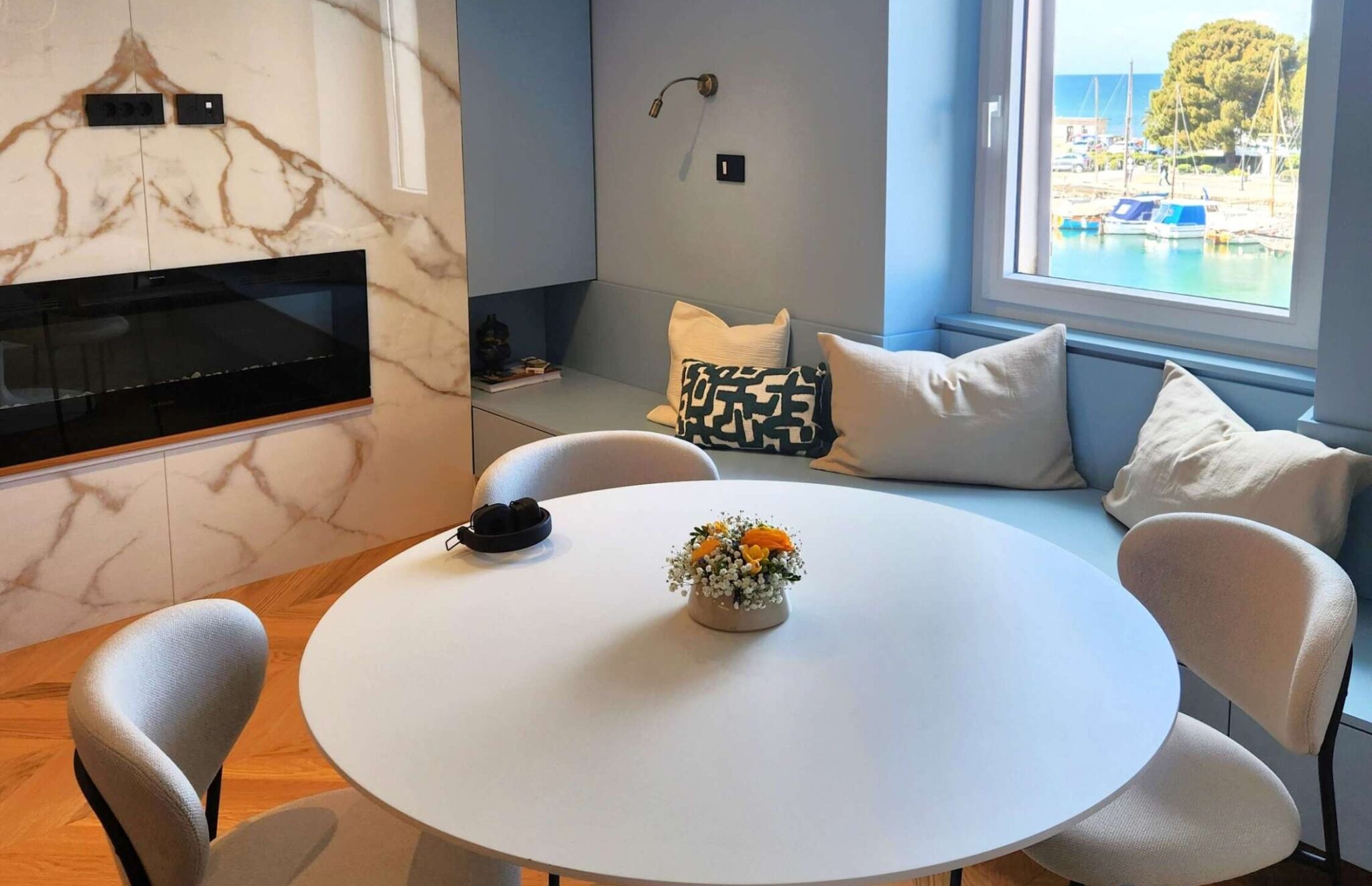 Spustimo se nazaj na tla, pravzaprav čisto k morju. Ob izolskem mandraču smo se sprehodili po stanovanju, navdahnjenem z navtiko. Negovi posebnosti sta možnost za privez čolna tik pred vrati, in interjer, ki ga zaznamuje modrina obzorja.
