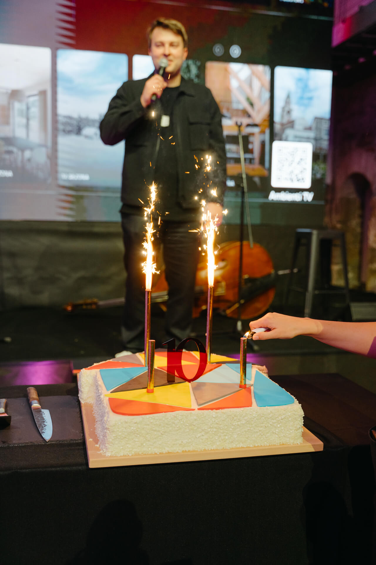 Praznovanje 10. rojstnega dne oddaje Ambienti je z glasbenim nastopom kronal Bojan Cvjetićanin, pevec skupine Joker Out. To je imelo simboličen pomen, saj tudi ta uspešna glasbena zasedba letos praznuje svojo 10-letnico, kar je še dodatno povezalo energijo ustvarjalnosti in vztrajnosti, ki prežema obe zgodbi o uspehu.