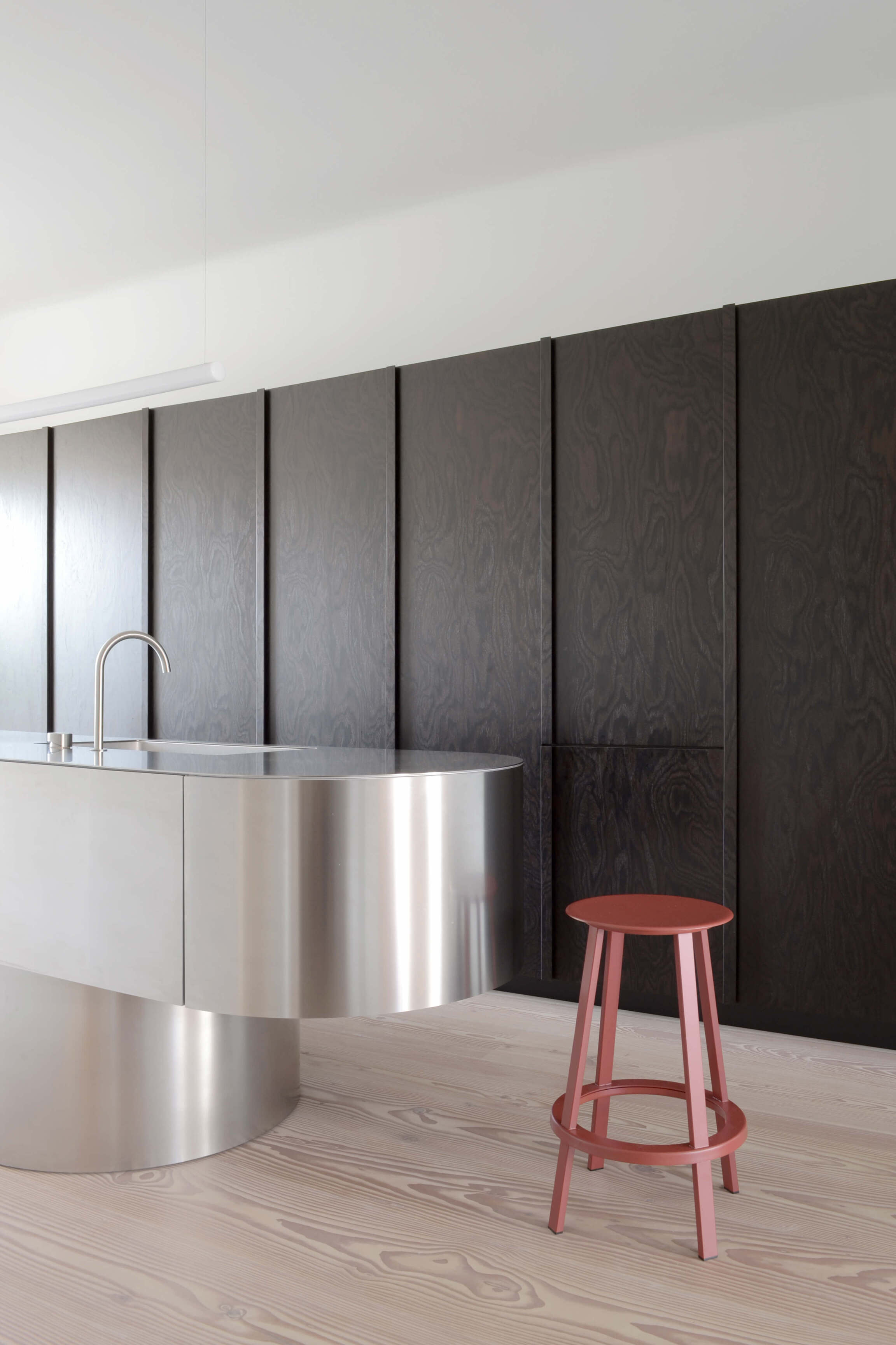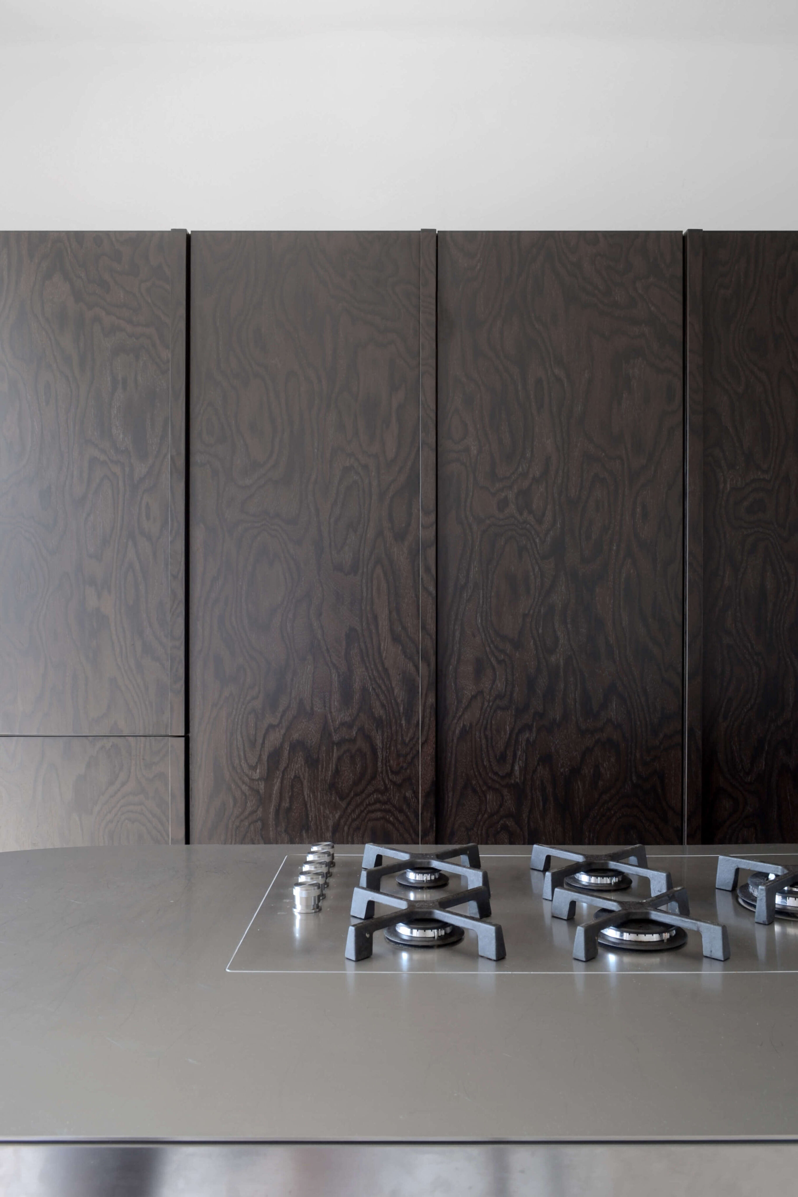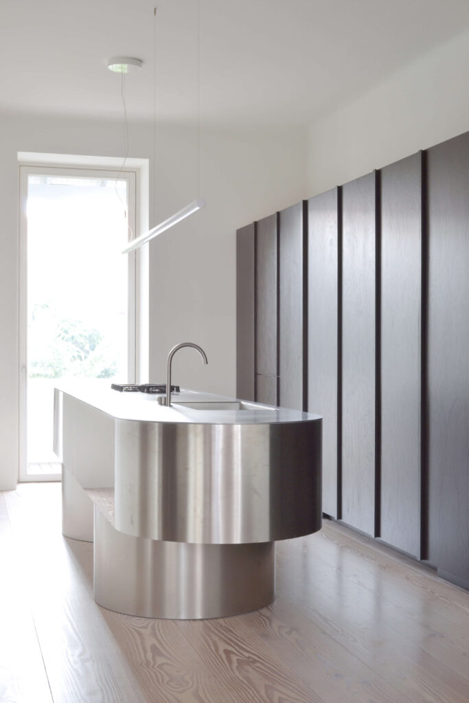 Osrednji poudarek bivalnega prostora predstavlja kuhinja. Dolg niz omar iz temnejšega materiala ustvarja izrazit kontrast svetlemu ovoju prostora, medtem ko zaobljen otok iz nerjavečega jekla vnaša zanimivo napetost med hladnim materialom in mehko obliko. Prav ta dialog med materiali prostoru daje značaj, ne da bi pri tem porušil njegovo umirjenost.