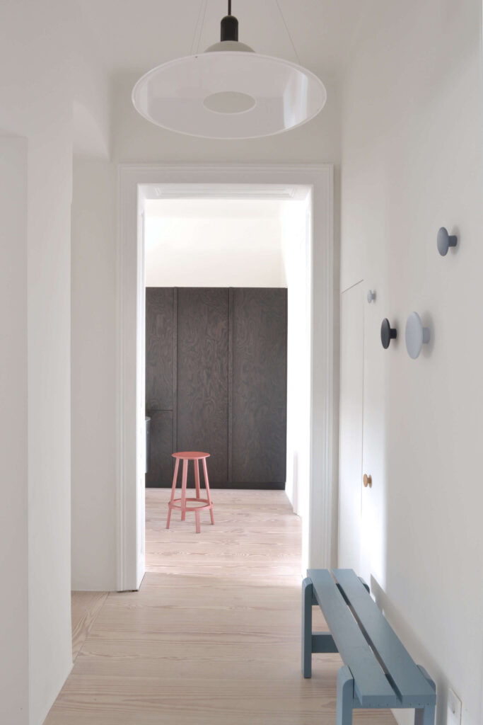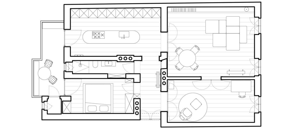 Izhodišče prenove je bilo jasno: stanovanju povrniti prvotno logiko tlorisa in mu vrniti prostorsko pretočnost. Prejšnji posegi so namreč razdelili prostore in zabrisali njihovo osnovno zasnovo. Arhitekti so zato odstranili naknadne dodatke, ponovno odprli prehode in obnovili dvokrilna vrata, ki danes znova vzpostavljajo značilno sosledje prostorov.