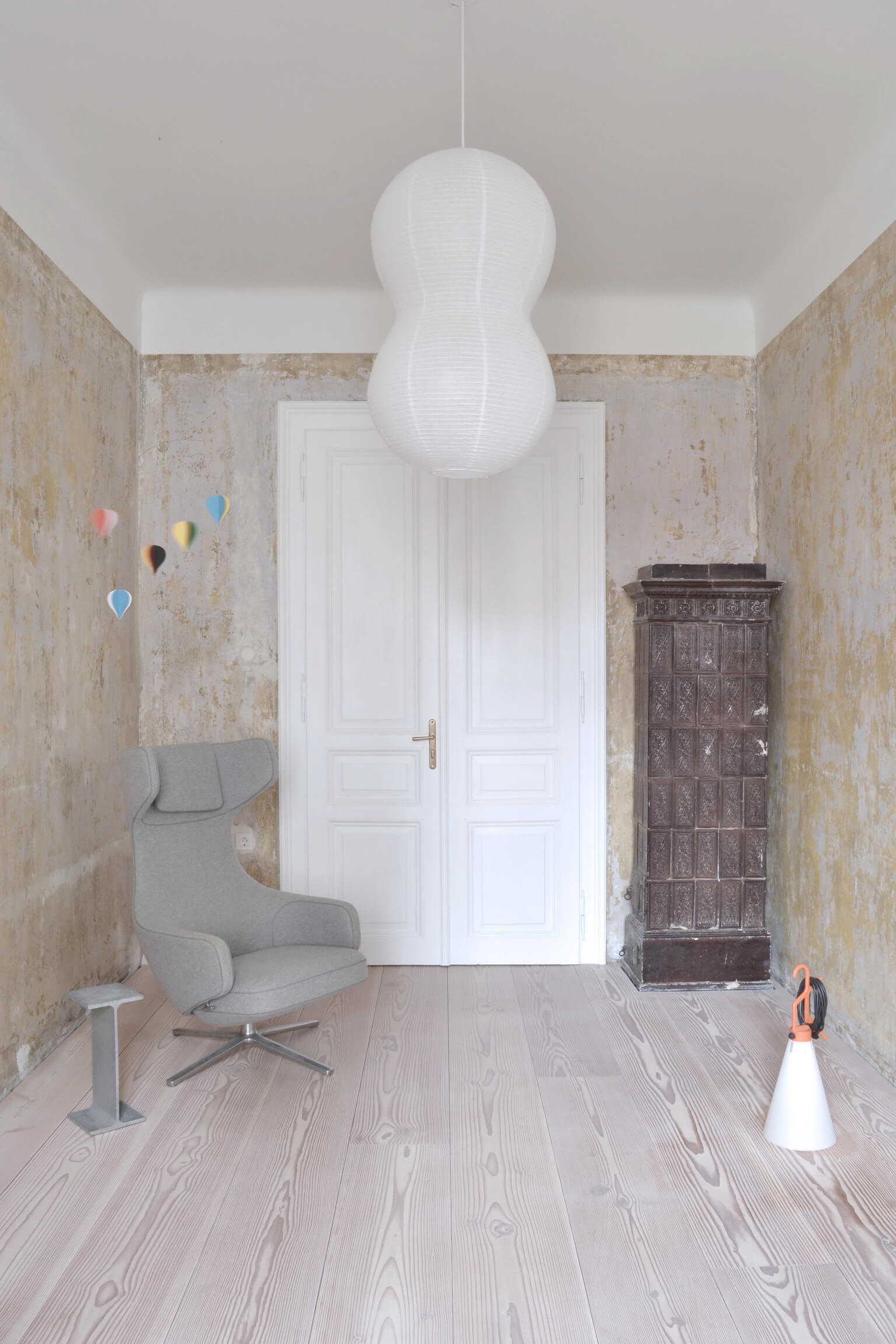 V otroški sobi so arhitekti ubrali še posebej subtilen pristop. Pod plastmi tapet se je razkril raznobarven oplesk, ki so ga ohranili in zaščitili. Skupaj z originalno lončeno pečjo ustvarja prostor izrazito atmosfero, zato so novo pohištvo umeščali minimalno – dovolj, da prostor deluje funkcionalno, a ne izgubi svoje zgodovinske plasti.