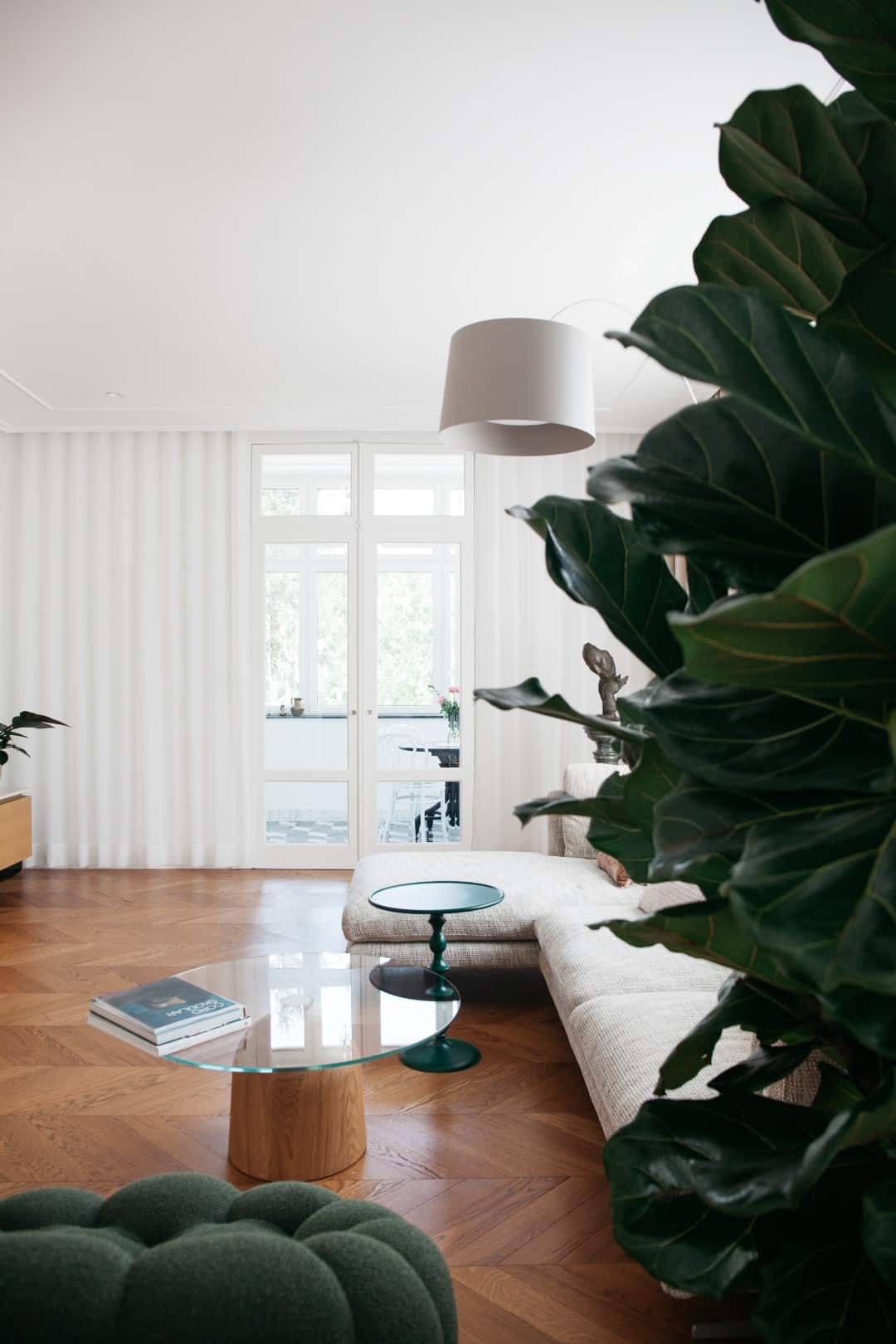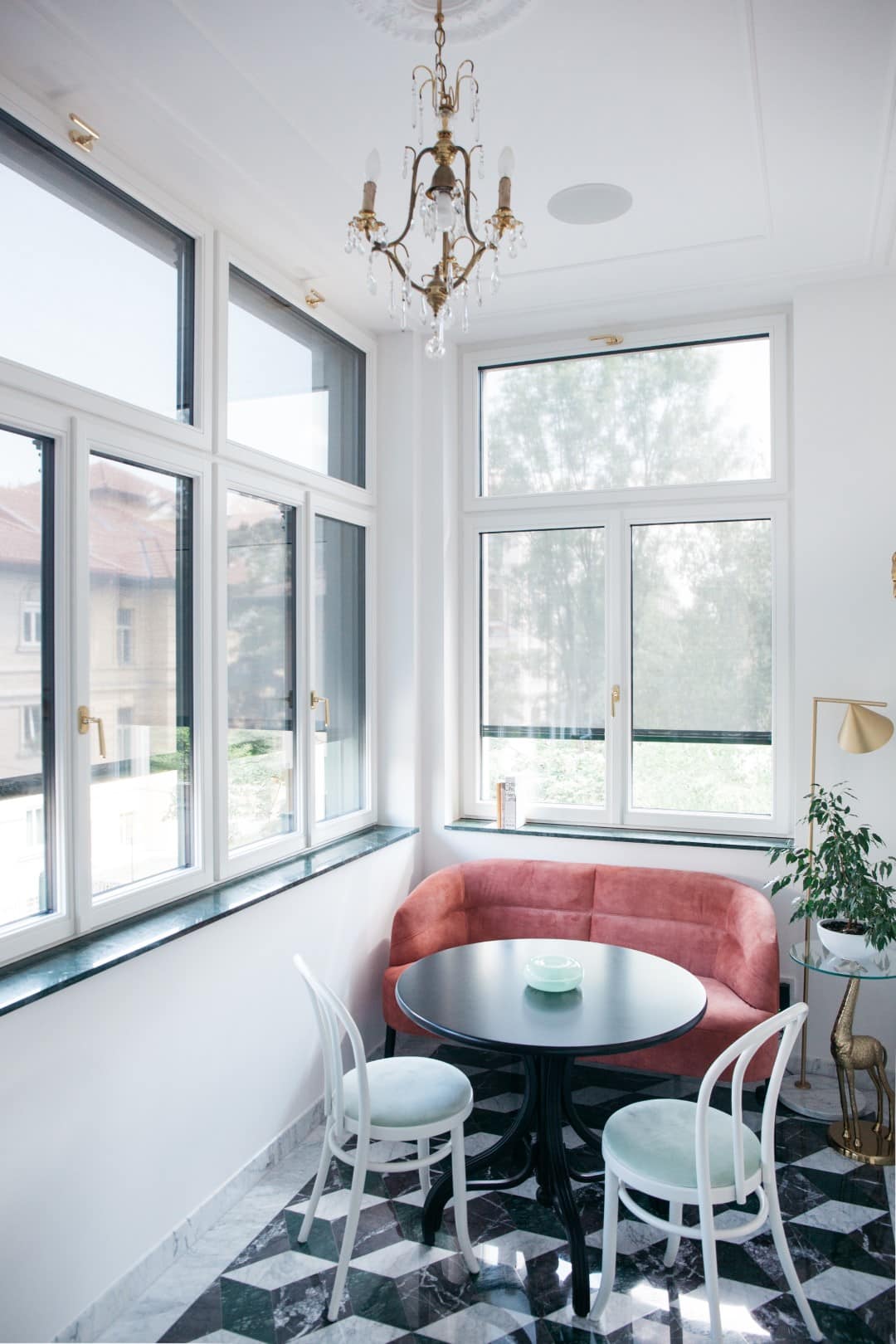 Stanovanje dovršenih detajlov je načrtovala arhitektka Anja Mencinger, ki je izhodišča za opremo iskala predvsem pri željah naročnikov, izhajala pa je tudi iz samega objekta. Elemente secesije je iz zunanjosti prenesla tudi v notranjost, kažejo pa se kot zlati poudarki na pohištvu, zlate kljuke in pipe ter rastlinske in geometrijske oblike. Lep primer je zeleni kamen, ki ga najprej vidimo na stopnišču, medtem ko se v notranjosti pojavi v vhodnem delu v tlaku, v loži in kopalnicah. »V eni kopalnici je uporabljen tako, da smo iz njega naredili umivalnik, v drugi pa kot stenska obloga in pult.«