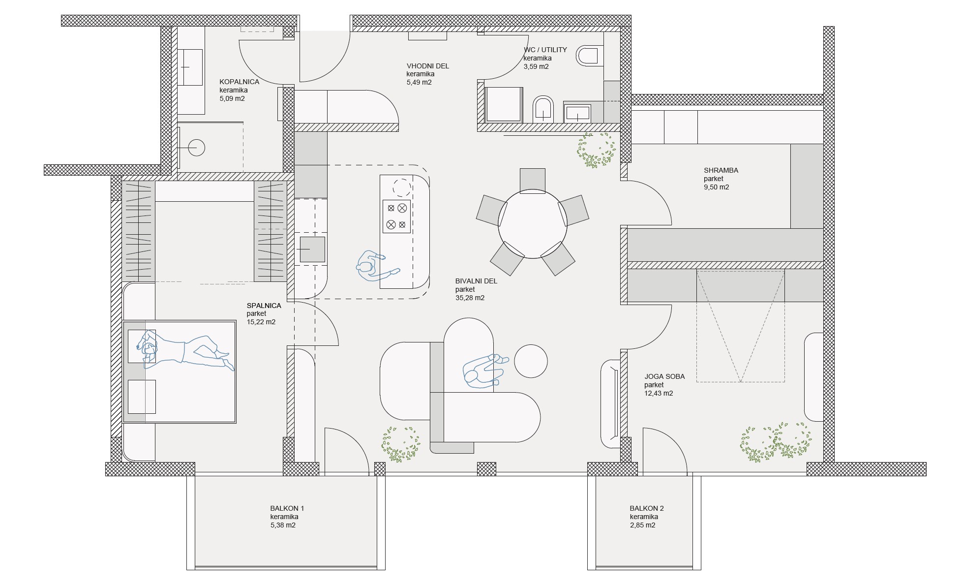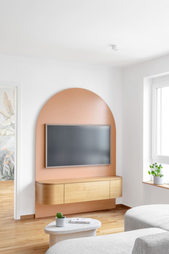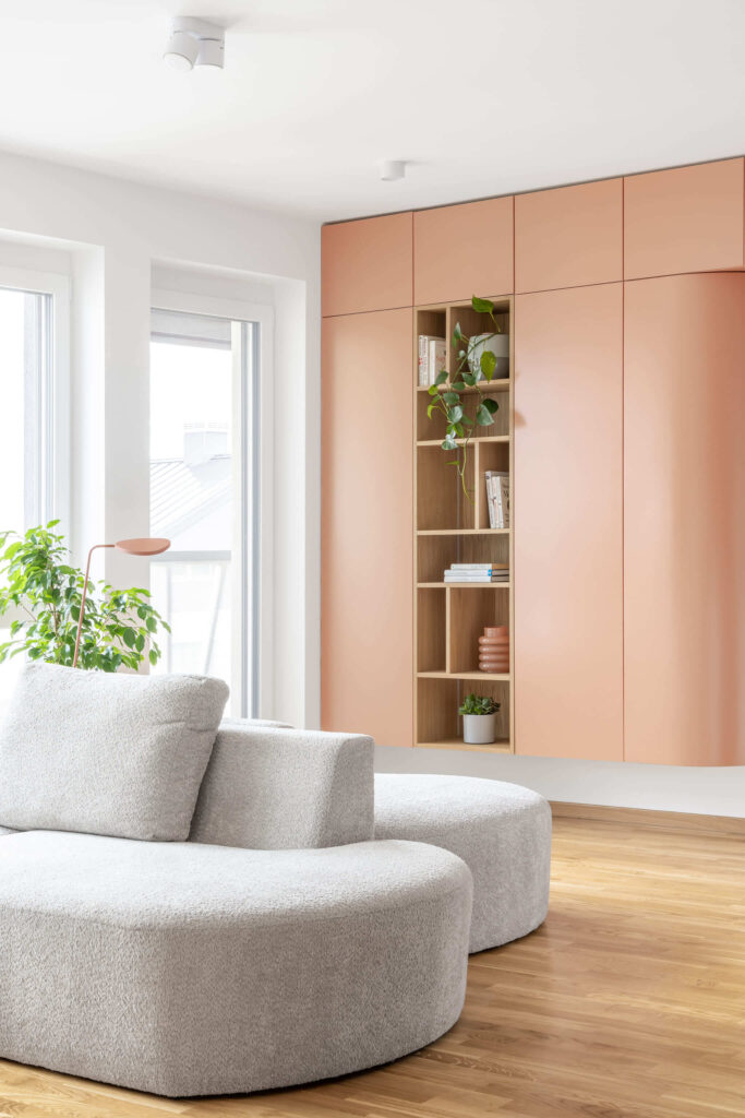 Poseben poudarek so zaobljeni robovi pohištva. Mehčajo prostor in hkrati omogočajo lahkotno gibanje po kvadratni tlorisni zasnovi, kjer so prehodi lahko hitro postali ozki ali neudobni. Organske linije se zrcalijo tudi v izbiri sedežne garniture. Modularna, dvostranska zasnova omogoča dvoje: na eni strani intimni bralni kotiček, na drugi sproščeno gledanje televizije. Obenem oblika sledi krogu, ki ga v prostor vnaša jedilna miza in tako povezuje vse bivalne funkcije.