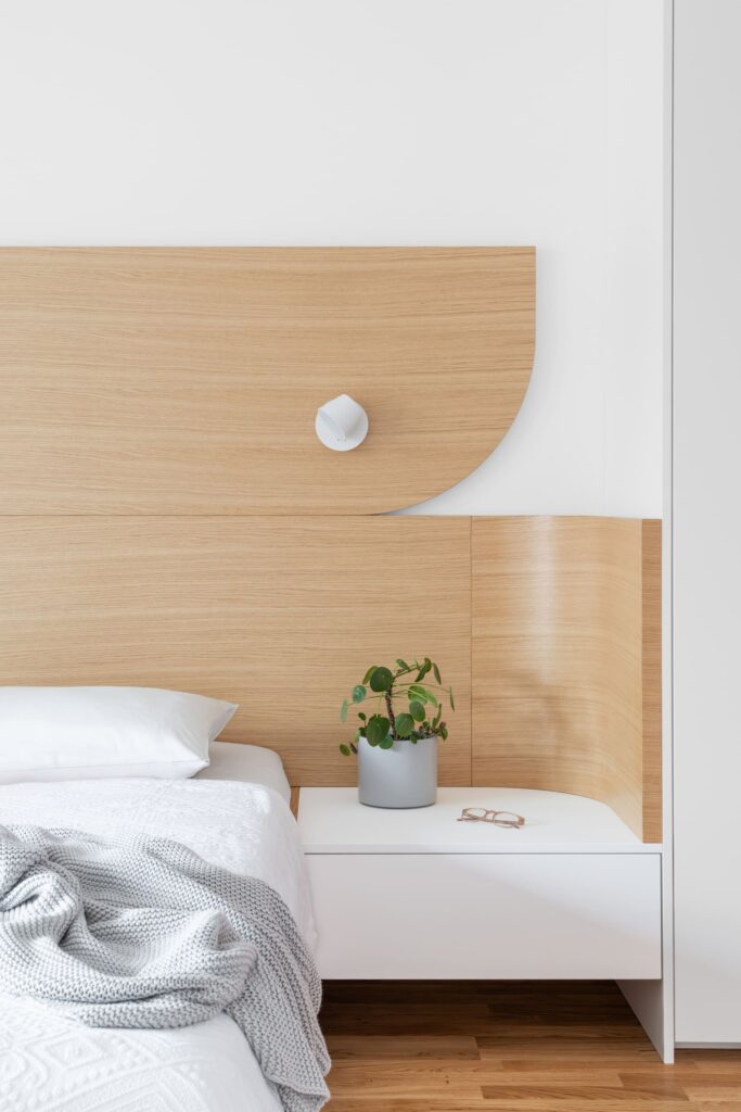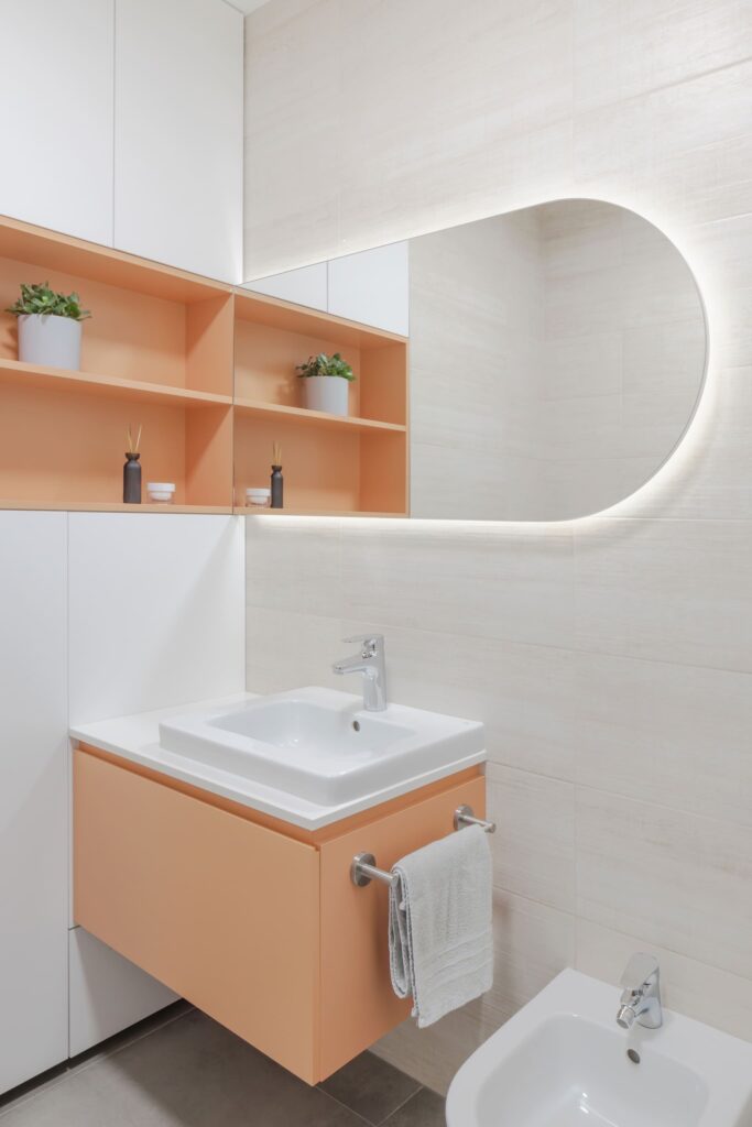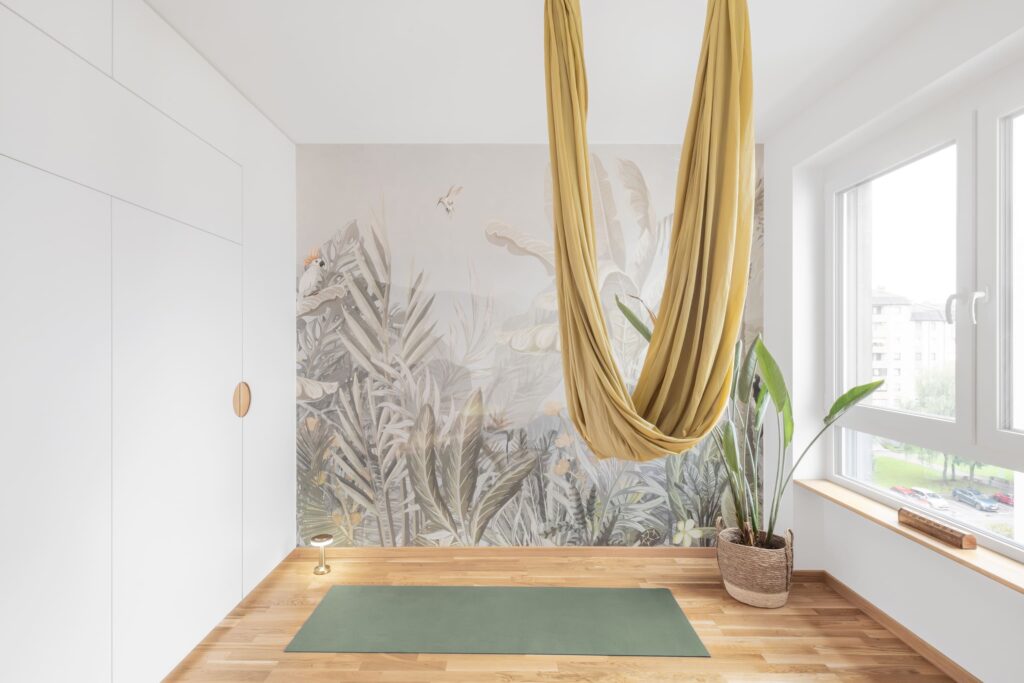 Tudi drugi prostori sledijo tej logiki: spalnica z lesenim vzglavjem in velikimi garderobnimi omarami, joga soba kot prostor praznine in tišine, ki občasno postane soba za goste, ter drobno zasnovan vhodni del, kjer vsak centimeter najde svoj namen. Utility skriva tudi pralni in sušilni stroj, kar dokazuje, da je v tem stanovanju estetika vedno podprta s funkcionalnostjo.