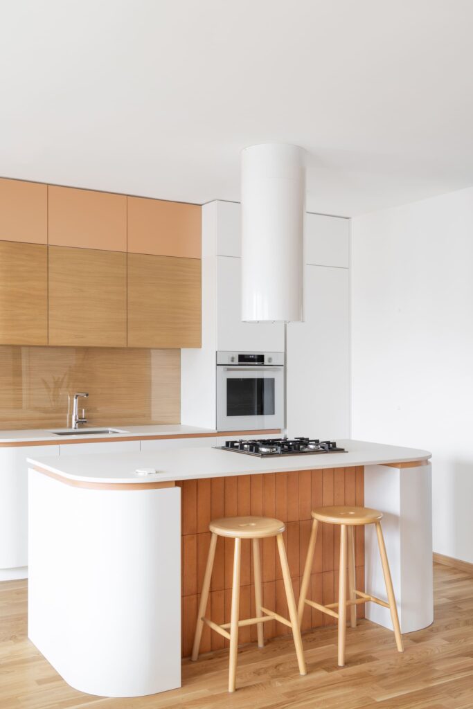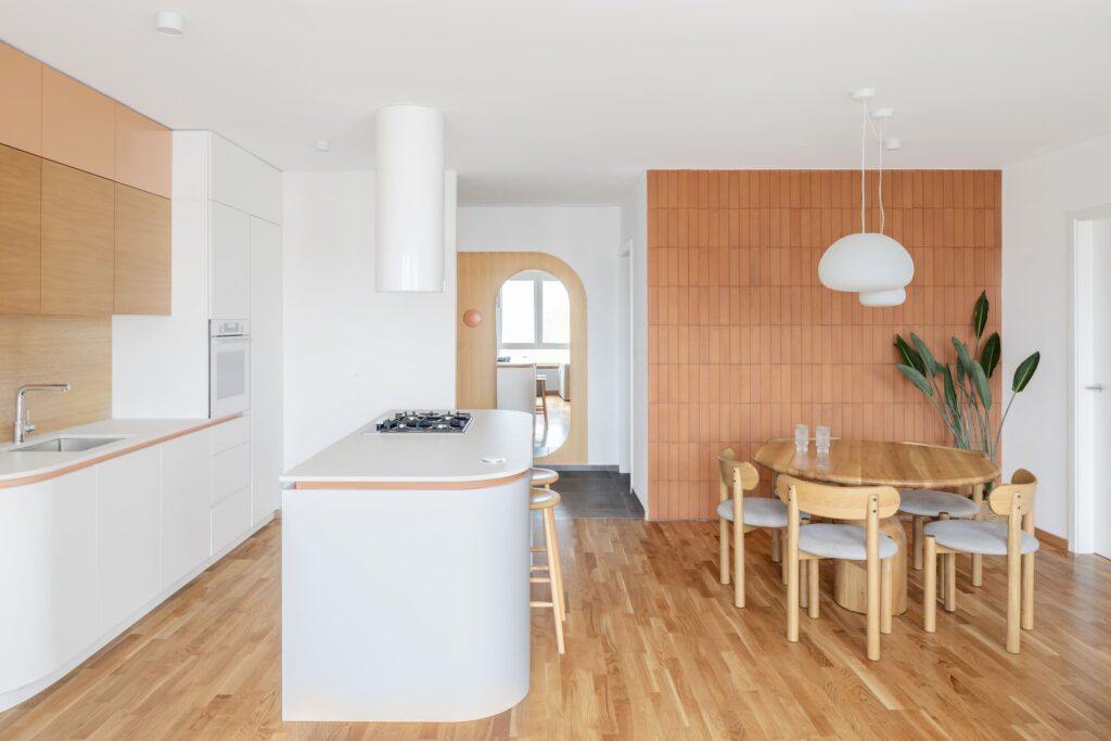Prvotni tloris bivalnega dela ni ponujal veliko – majhna kuhinja, nelogičen potek vrat in omejena gibljivost pohištva. Ker instalacije še niso bile dokončno izvedene, se je odprla priložnost za korenito prenovo. Naročnika sta si želela kuhinje, ki ne bi bila le prostor priprave obrokov, temveč srce doma, kjer se par srečuje, kuha, ustvarja. Tako je kuhinja postala osrednji element dnevnega prostora, razširjena v nišo okoli vrat in dopolnjena s kuhinjskim otokom, ki se kot bel otok v prostoru povezuje z opečnato steno jedilnice. Ta kombinacija barv, materialov in oblik ustvarja občutek mehkobe, hkrati pa močno prostorsko identiteto.
