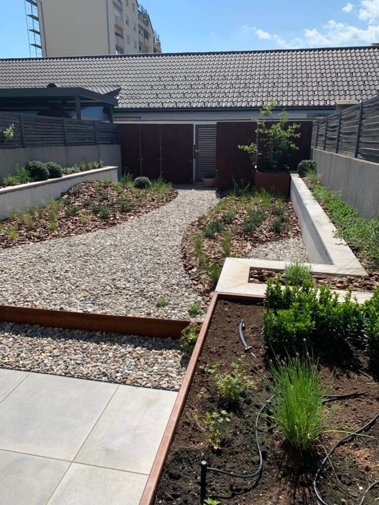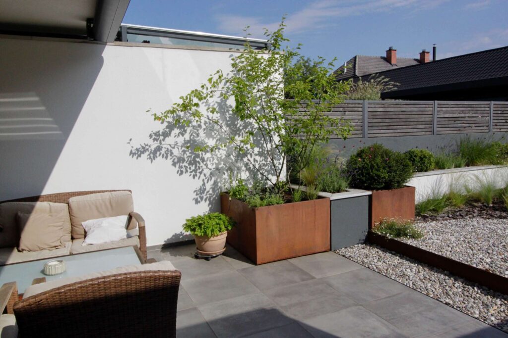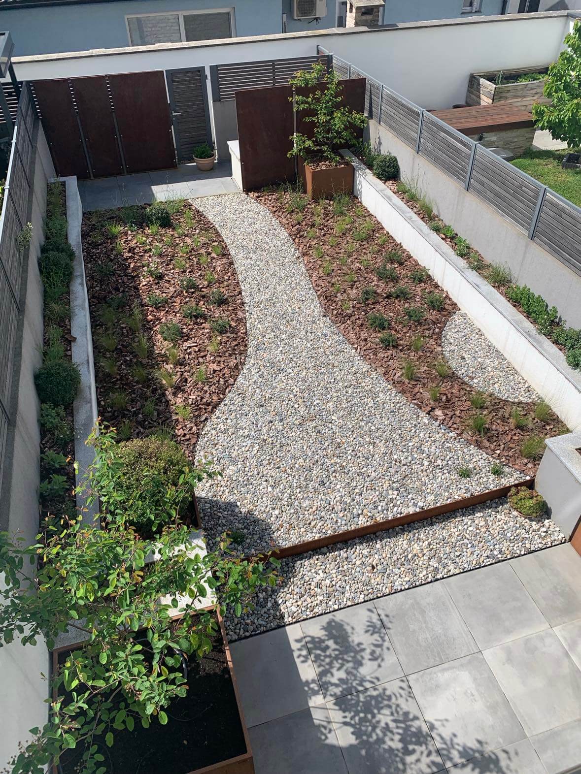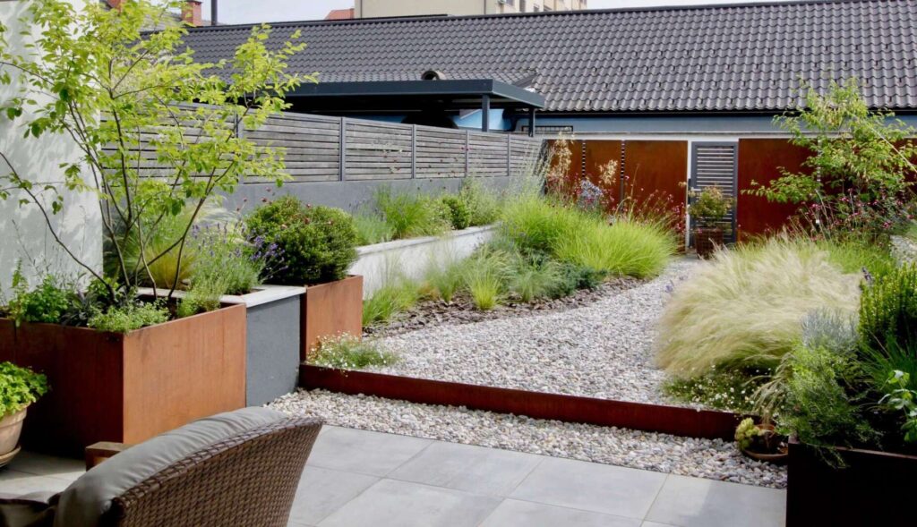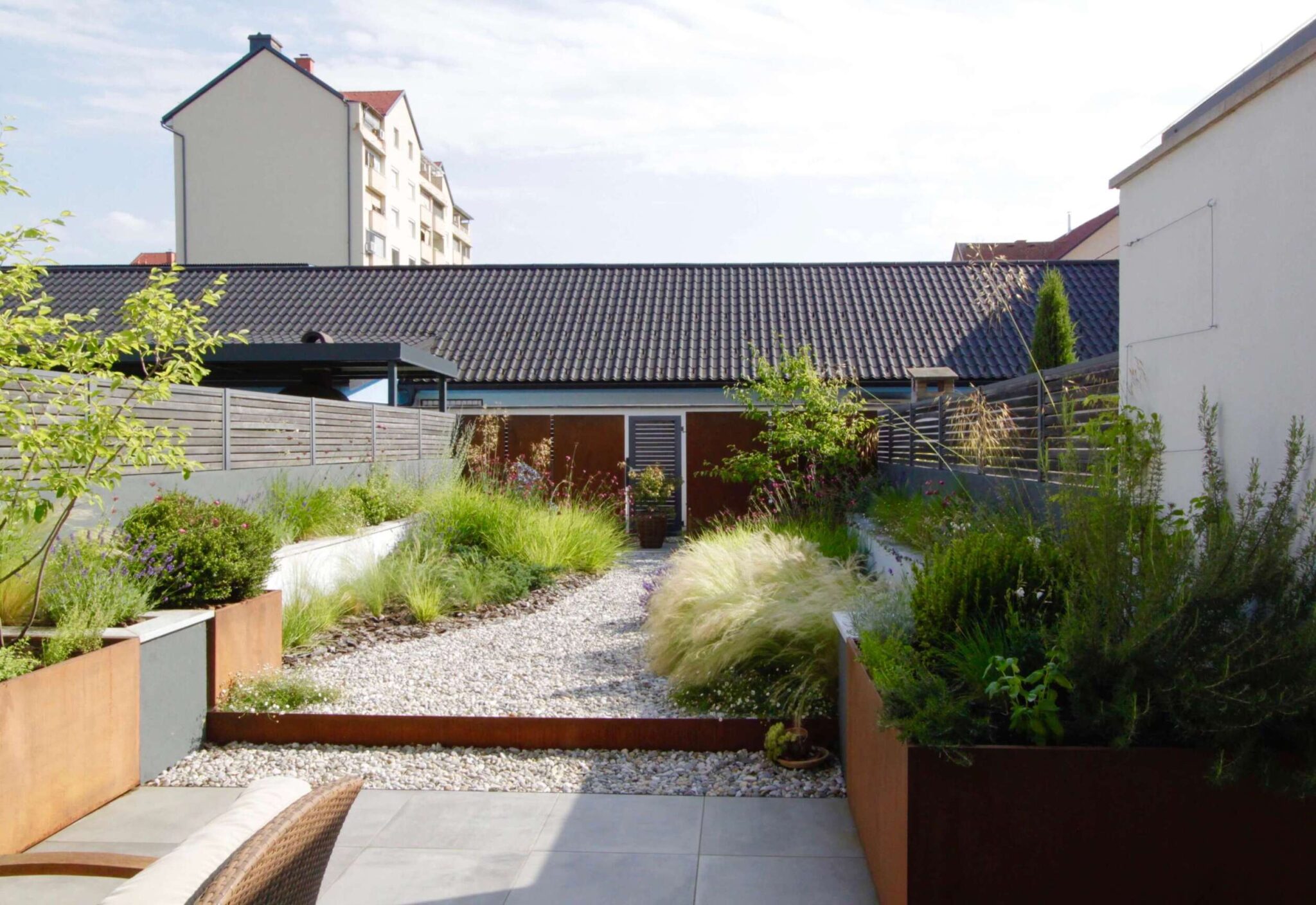 Da bi premagal sivino prostora, je oblikovalec izbral material, ki je postal zaščitni znak vrta: korten. Njegova bakrenorjava barva se je izkazala za popolno protiutež betonu in hladnim tonom okolice. Iz njega so nastale dvignjene grede, posode in paneli, ki zakrivajo prezračevalni jašek. Vrt je tako dobil vizualno toplino, skoraj rustikalno mehkobo, hkrati pa sodoben, čist izraz.