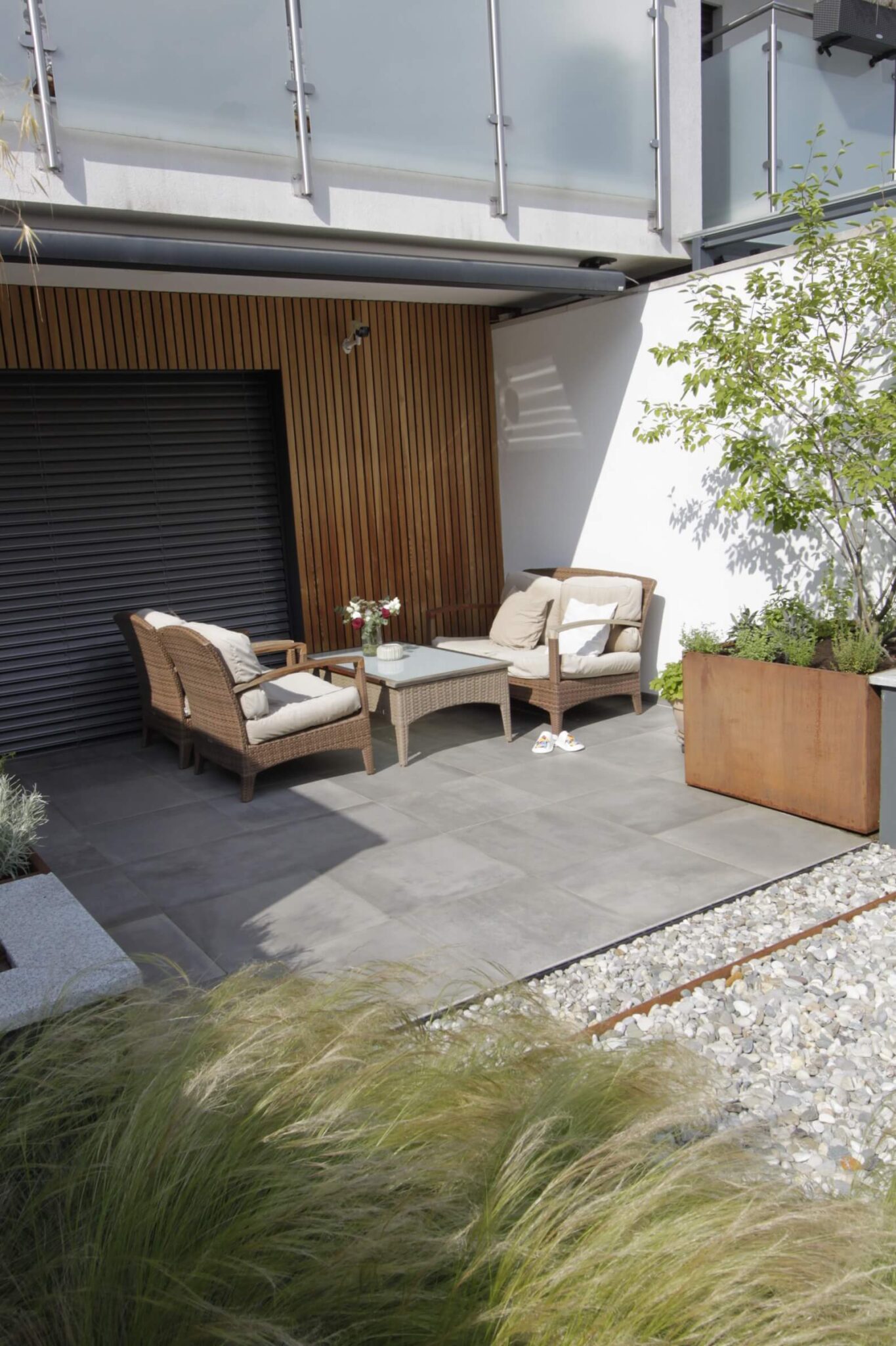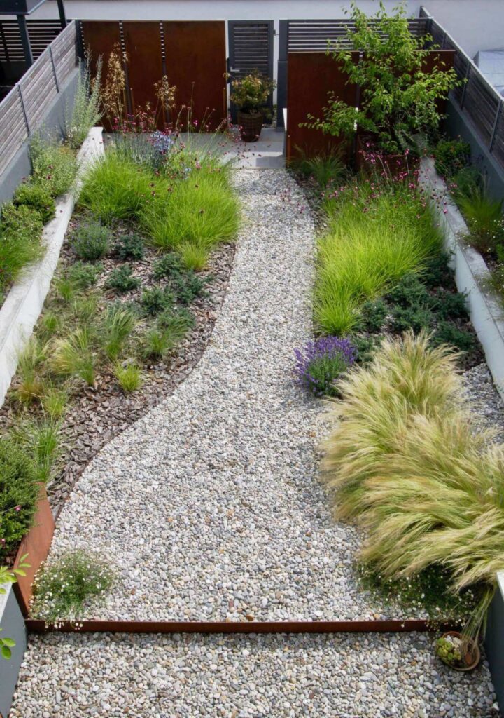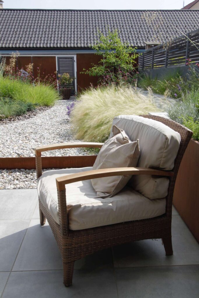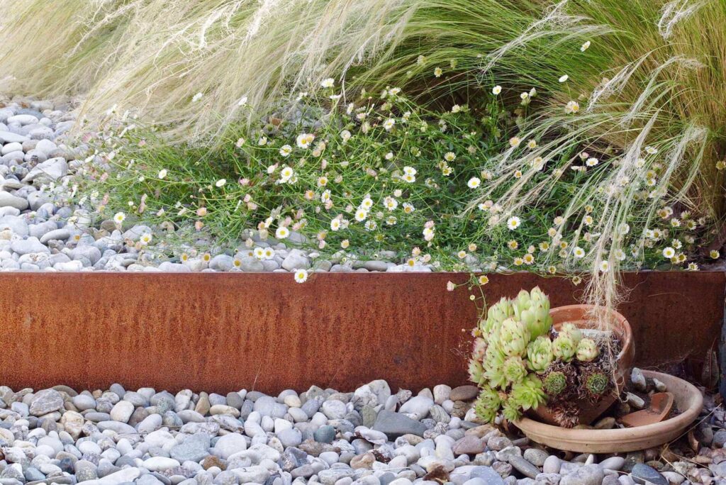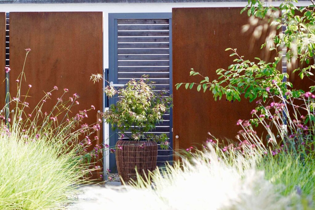 Da bi premagal sivino prostora, je oblikovalec izbral material, ki je postal zaščitni znak vrta: korten. Njegova bakrenorjava barva se je izkazala za popolno protiutež betonu in hladnim tonom okolice. Iz njega so nastale dvignjene grede, posode in paneli, ki zakrivajo prezračevalni jašek. Vrt je tako dobil vizualno toplino, skoraj rustikalno mehkobo, hkrati pa sodoben, čist izraz.