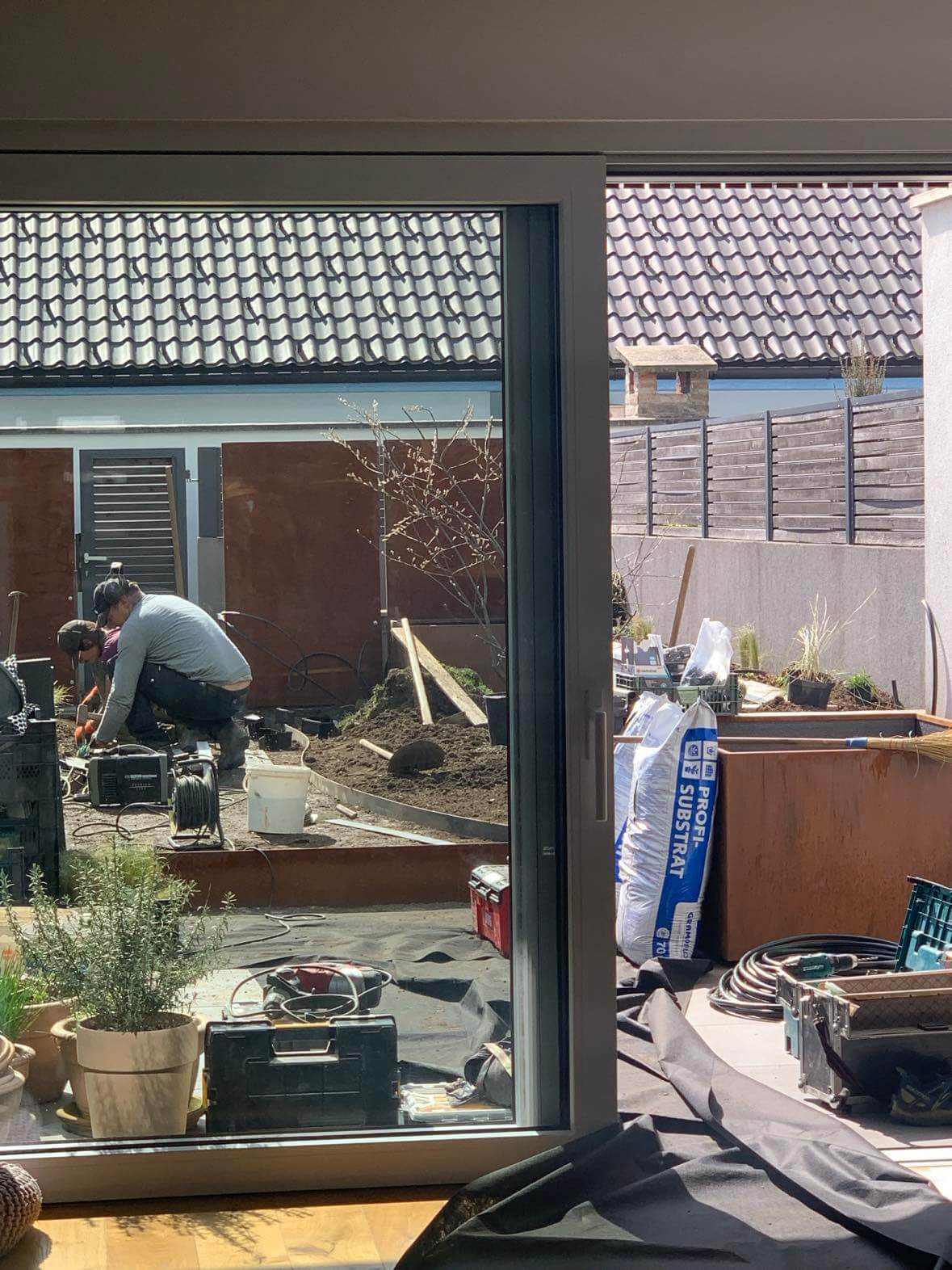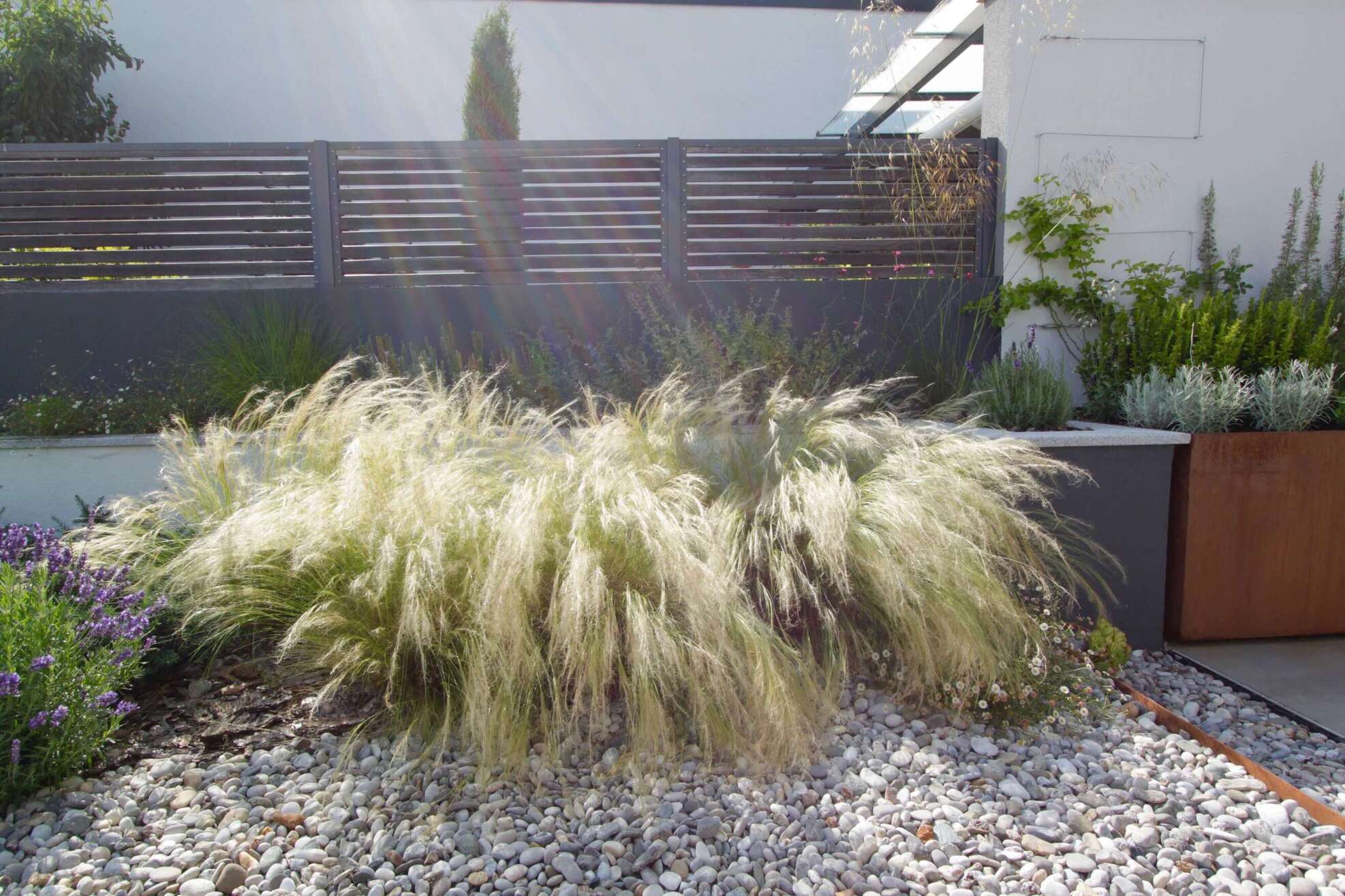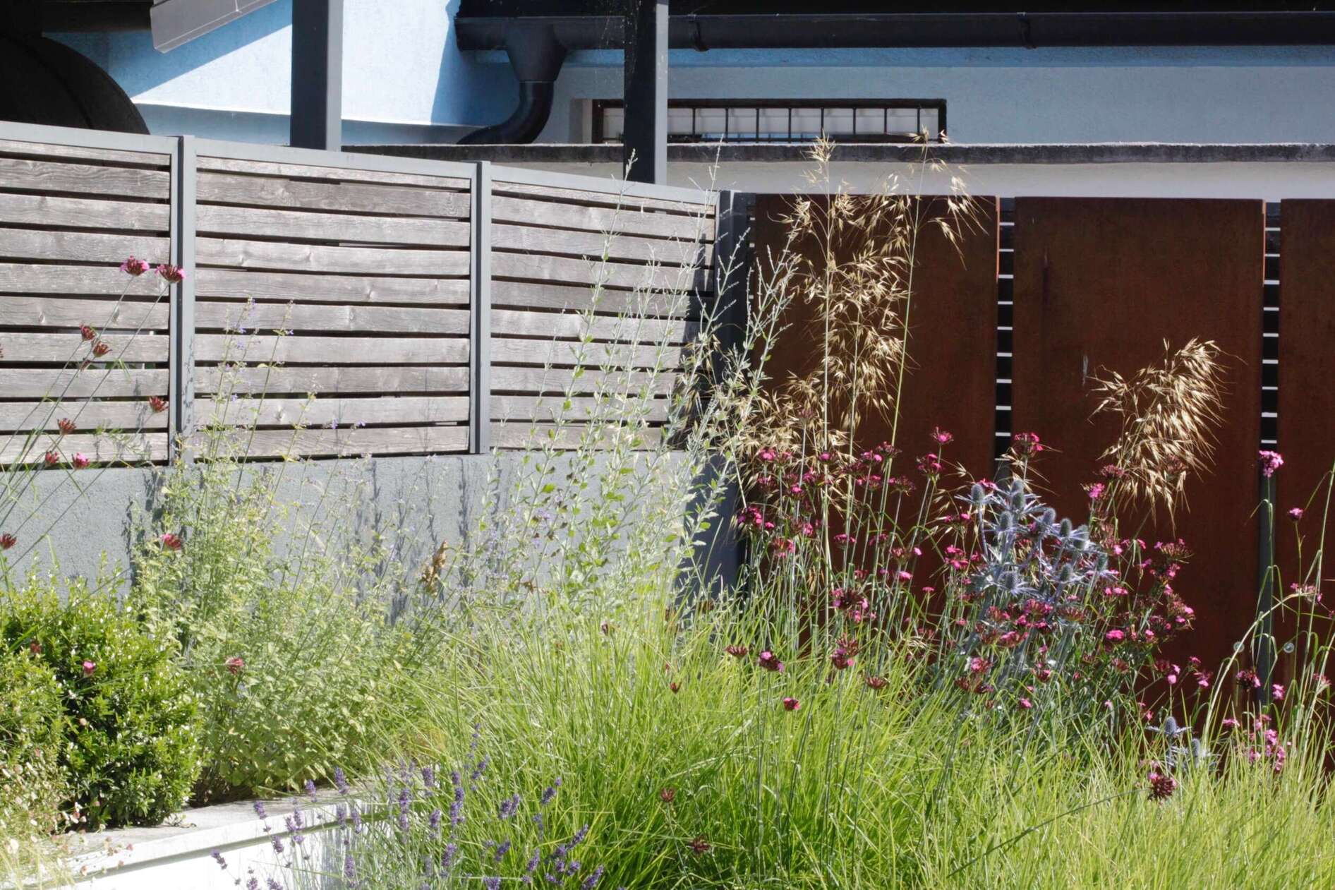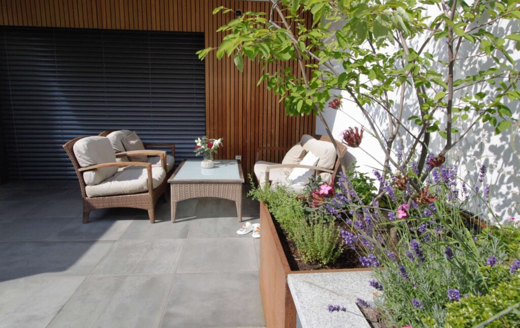 Da bi premagal sivino prostora, je oblikovalec izbral material, ki je postal zaščitni znak vrta: korten. Njegova bakrenorjava barva se je izkazala za popolno protiutež betonu in hladnim tonom okolice. Iz njega so nastale dvignjene grede, posode in paneli, ki zakrivajo prezračevalni jašek. Vrt je tako dobil vizualno toplino, skoraj rustikalno mehkobo, hkrati pa sodoben, čist izraz.