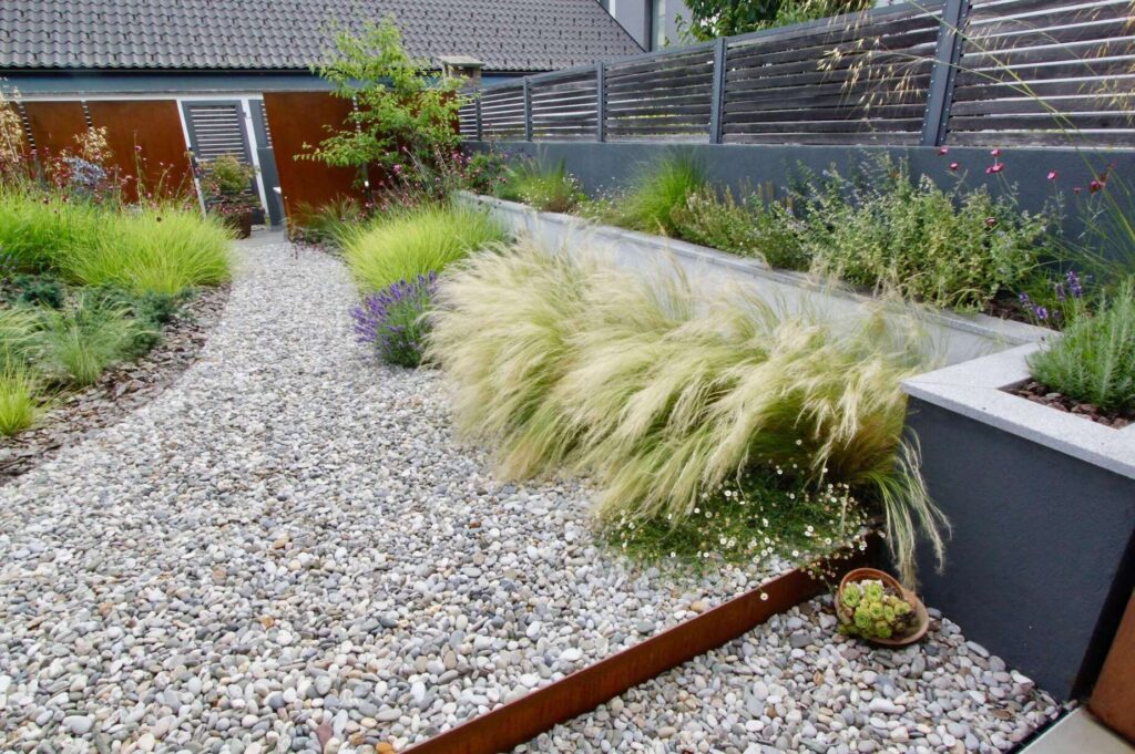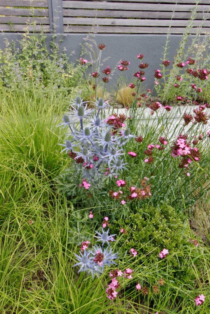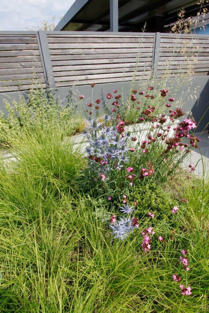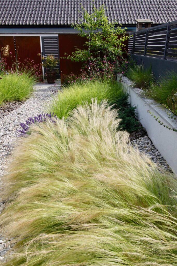 V gredice ob tleh je Matic nežno vpletel slovenski pridih: posadil je nageljček kartavžar, ki ga krasijo rožnati cvetovi, in jesensko vilovino. Slednja s svojo jabolčno zeleno barvo ustvarja skoraj pravljičen kontrast s kortenom. To poetično domačnost dopolnjuje nežna bodalica (Stipa tenuissima), ki boža ozračje in igrivo plapola v vetru. Tudi sicer na vrtu nekoliko izstopa suhotravniška zasaditev.