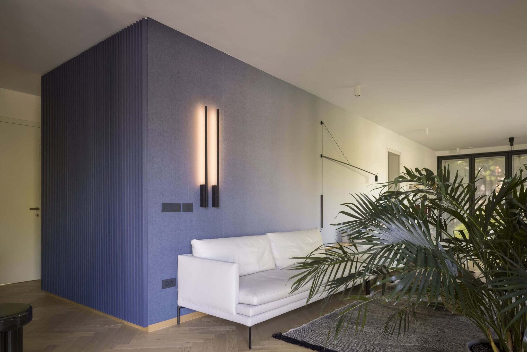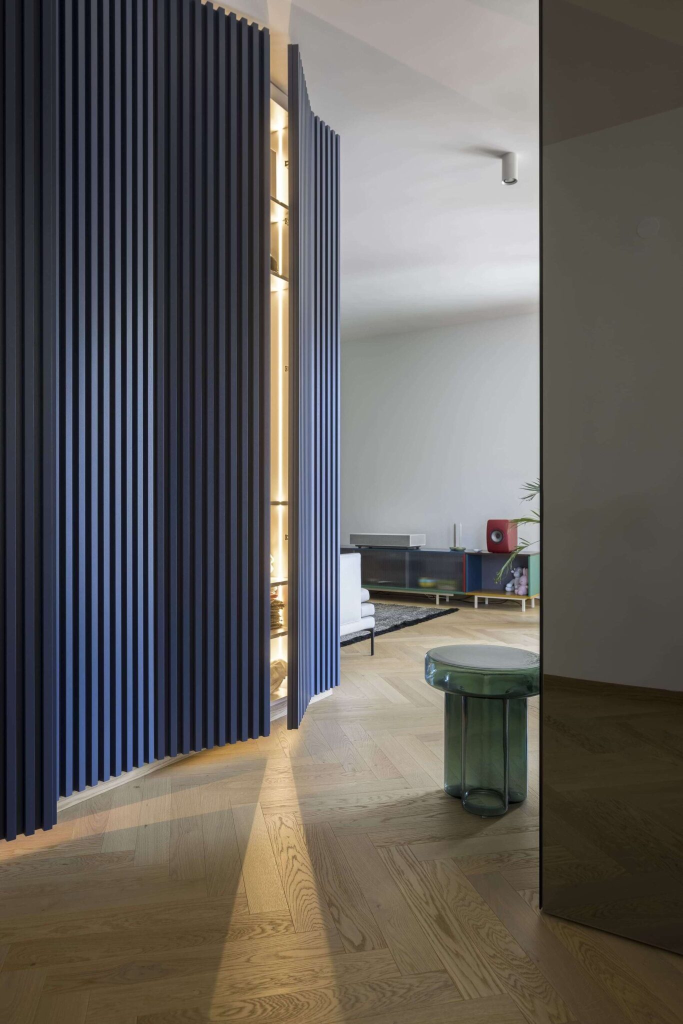 Drugi večji barvni poudarek, kot protiutež otoku, je umeščen v dnevno sobo in sestavljen iz dveh delov – omare v niši in tapete. Tapeto so umestili na najdaljšo steno stanovanja – enajst metrov dolg del dnevne sobe, kjer preseneti prelivajoča se barvna tapeta – barvni gradient, ki se iz intenzivne temno modre prelije v belo. Vogal dnevne sobe, kjer je barva rebraste omare enaka barvi tapete, tako deluje kot poudarjen kubus, ki v daljavi izginja.