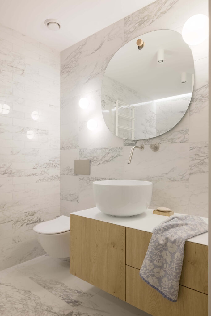 Del stanovanja s spalnicami in kopalnicama je ohranil prvotno razporeditev. Vsi prostori so urejeni umirjeno, v osnovnih barvah, da stanovalce pomirijo in ustvarijo občutek zavetja. Barvni poudarki so prisotni le v drobnih kosih opreme v sobah.
