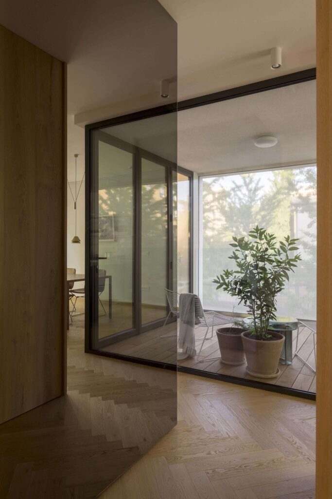 Nabor materialov, uporabljenih pri opremi tega stanovanja, ni nič takega, česar ne bi opazili tudi drugje: les, kovine, ogledala, steklo …, ključno je, kako in kje so ta gradiva uporabili. Navdušijo rešitve, kako opremiti 20 metrov dolg prostor, kako razčleniti vhodni del, ne da bi ga zaprli, kako z močnimi barvami pritegniti pogled, ne pa barv tudi postaviti v ospredje …