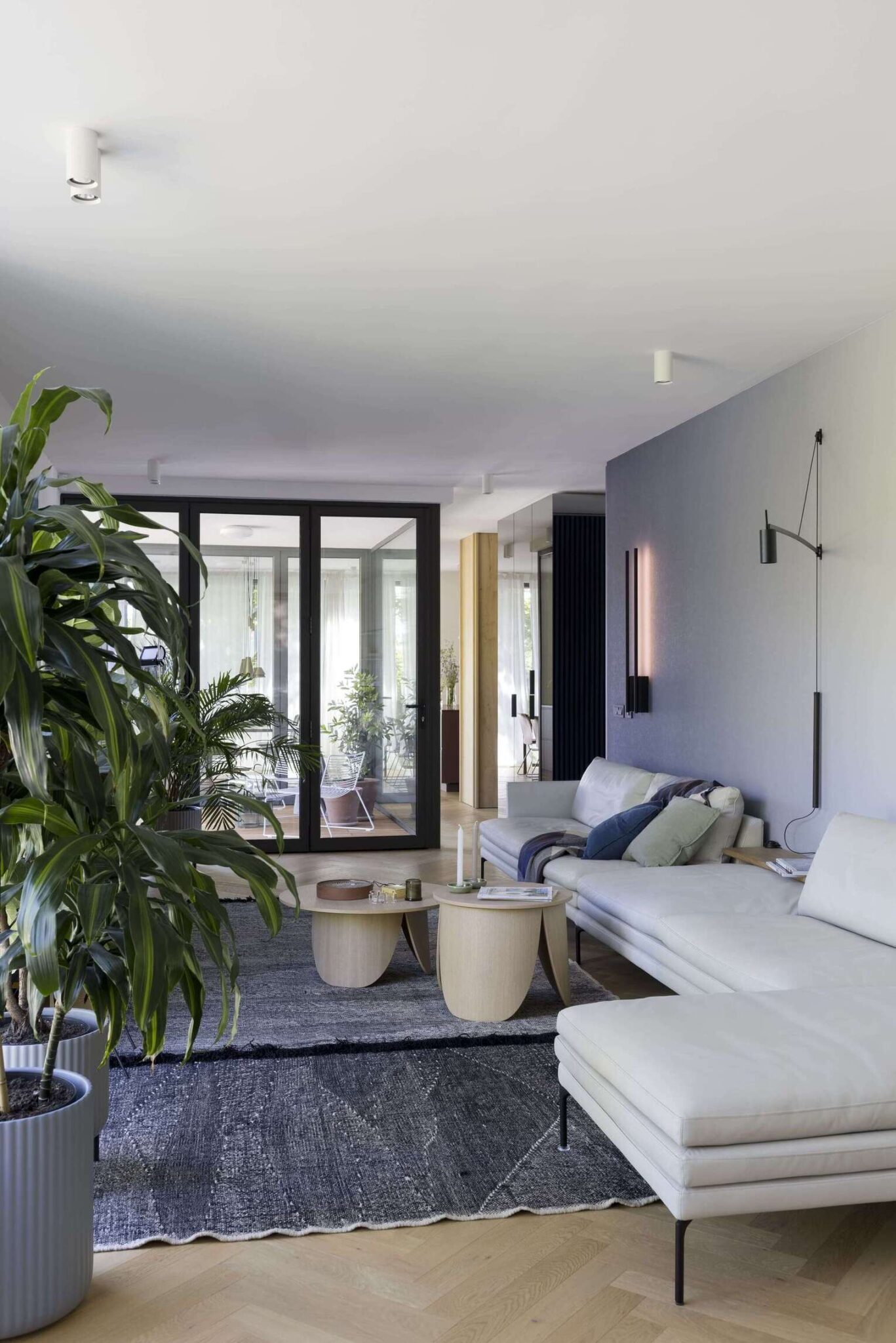 Stanovanje v Ljubljani meri 170 m² in zavzema celotno nadstropje elegantne stanovanjske stavbe iz leta 2020. Njegova prostornost je poudarjena z odprto zasnovo, ki dnevne prostore niza enega poleg drugega, brez jasnih mej.
