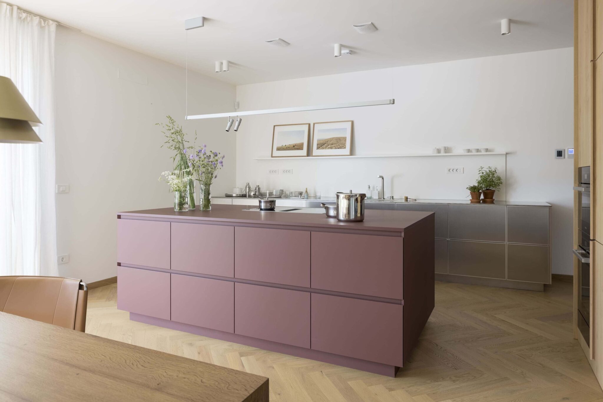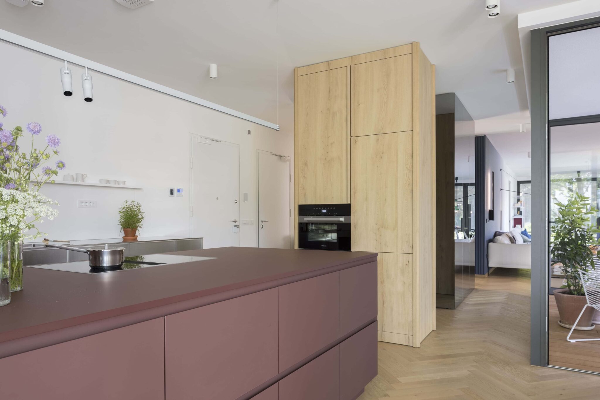 Kuhinje so se lotili tako, da so poskušali njeno vlogo skriti, kar so dosegli s tem, da so kuhinjske elemente razporedili v tri različne, a skladne kvadre: visok in ozek stolp v lesu, dolg nerjavni jekleni pult s predali v aluminiju z drobnim reliefom in enovit otok v temno bordo barvi. Barvno poudarjen otok je usklajen z jedilnico v toplih tonih: hrastova miza, usnjeni stoli v barvi konjaka, stena v nežno laneni barvi.