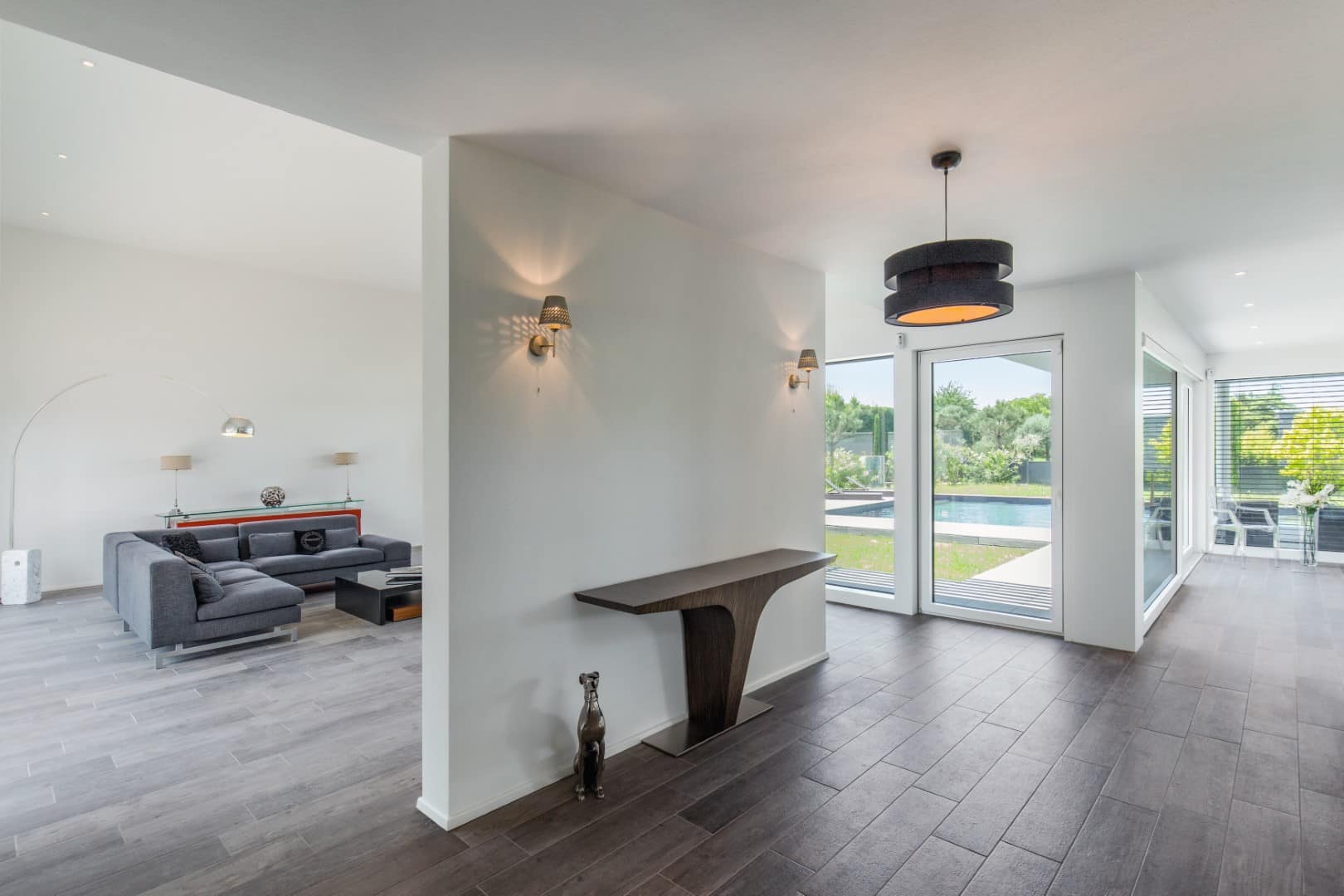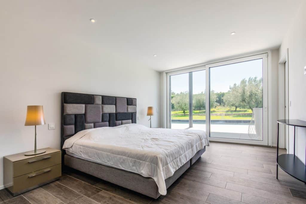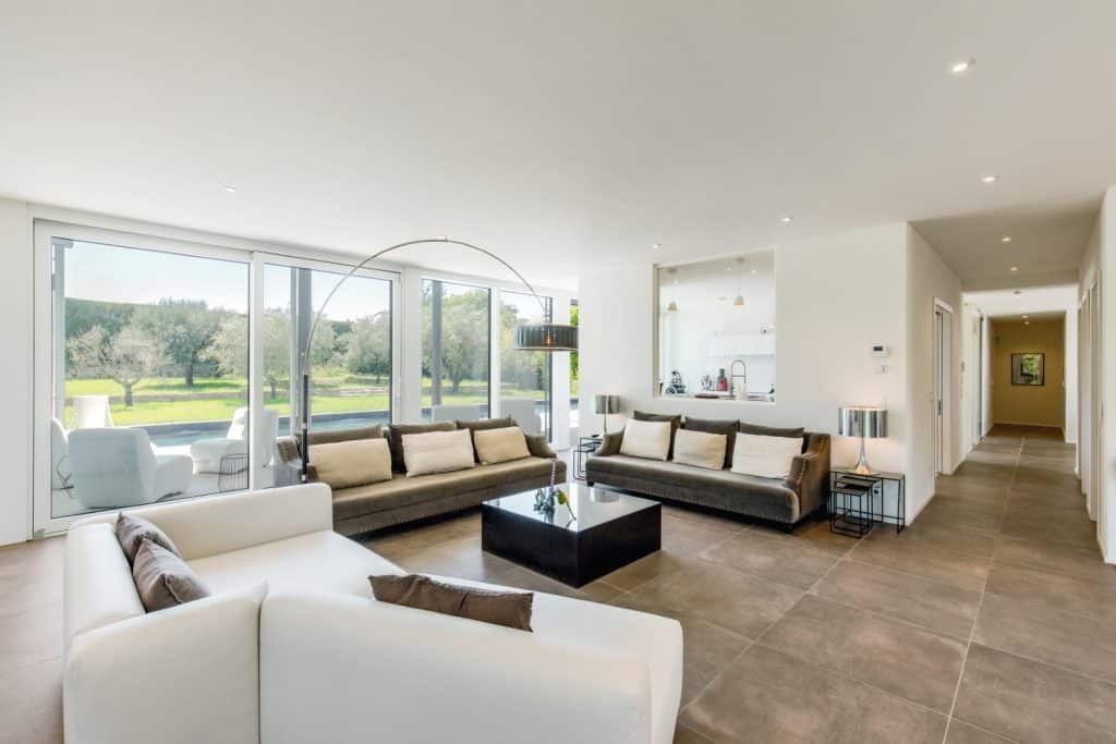 Objekt se z velikimi okenskimi površinami odpira na vrt, kjer je pokrita terasa, ki ob toplih večerih postane del interierja. Tudi kopalnice in spalnice so opremljene z zasteklitvijo do stropa, tako lahko iz vsake sobe uživamo v pogledu na oljčni nasad, medtem ko za zračnost v interierju skrbijo steklene pregradne stene. Med kuhinjo in dnevno sobo je denimo predelna stena s fiksno zasteklitvijo, ki ustvarja vizualno bližino, vendar ne prepušča hrupa in vonjav po kuhanju.