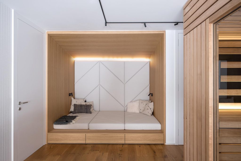 Rezultat je dovršen interier, ki združuje sodobno oblikovanje s toplino alpske tradicije, kjer je vsak kotiček namenjen sprostitvi in uživanju v gorskem okolju.