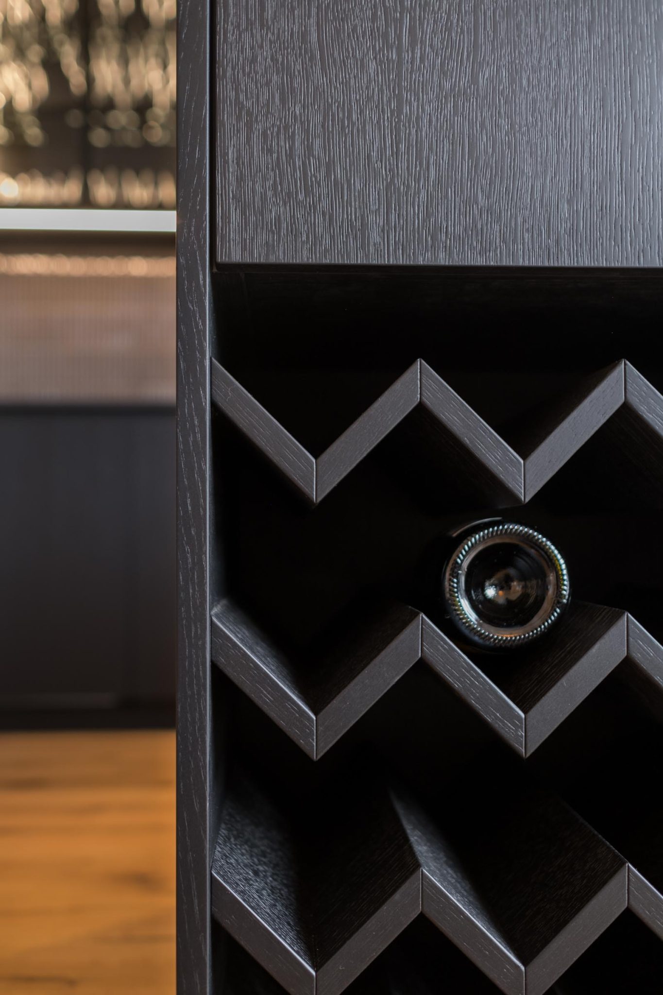 Objekt obsega tri nadstropja, med seboj oblikovno povezana. Osrednji prostor je odprt in svetel, kar zagotavljajo velike zasteklitve, ki zabrišejo mejo med okoliško naravo in interierjem. Ob vstopu se pred nami odpre udobno zasnovana dnevna soba s kaminom, obdanim v črno keramiko in nišo s klopjo. Velika jedilna miza z unikatnim furniranim vzorcem in mehka tapecirana klop povezujeta dnevni prostor s kuhinjo, ki je skupaj s sredinskim otokom izdelana iz črnega lesa, značilnega za alpsko okolje. Črni poudarki v zimskem času ustvarjajo kontrast z okolico in odražajo eleganco, hkrati pa lovijo sončne žarke in v prostore prinašajo občutek topline in udobja.