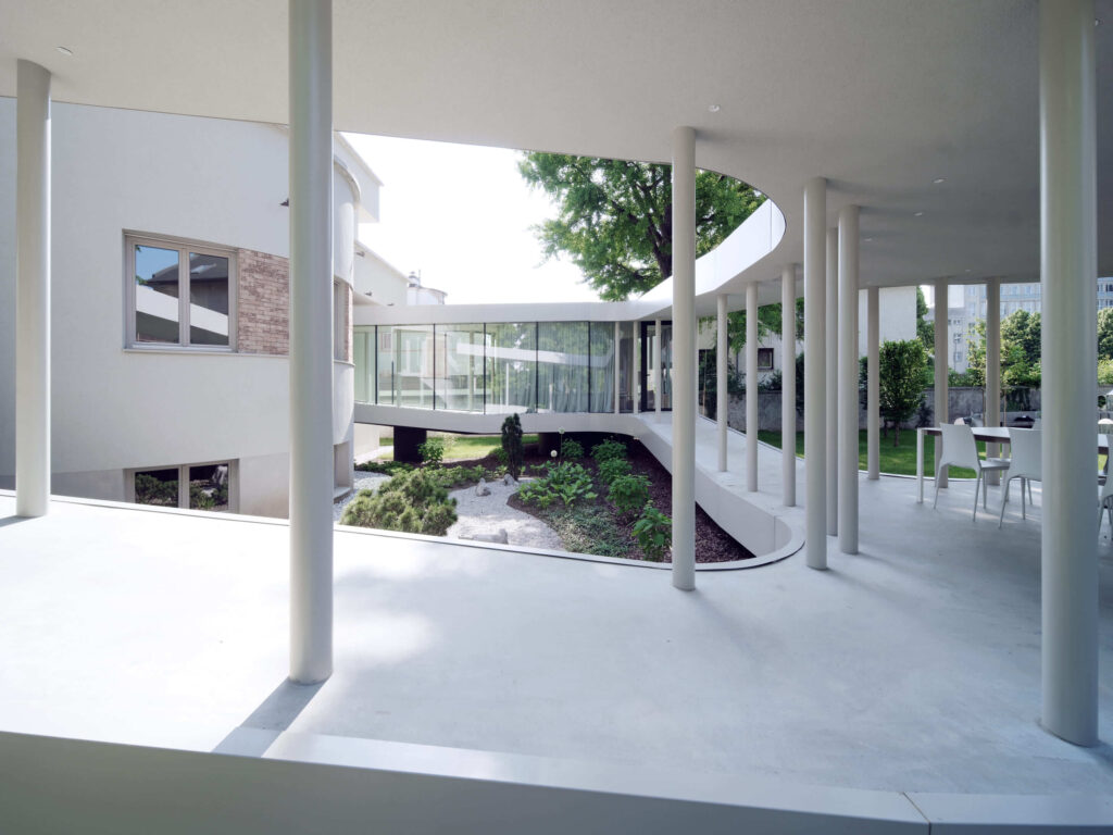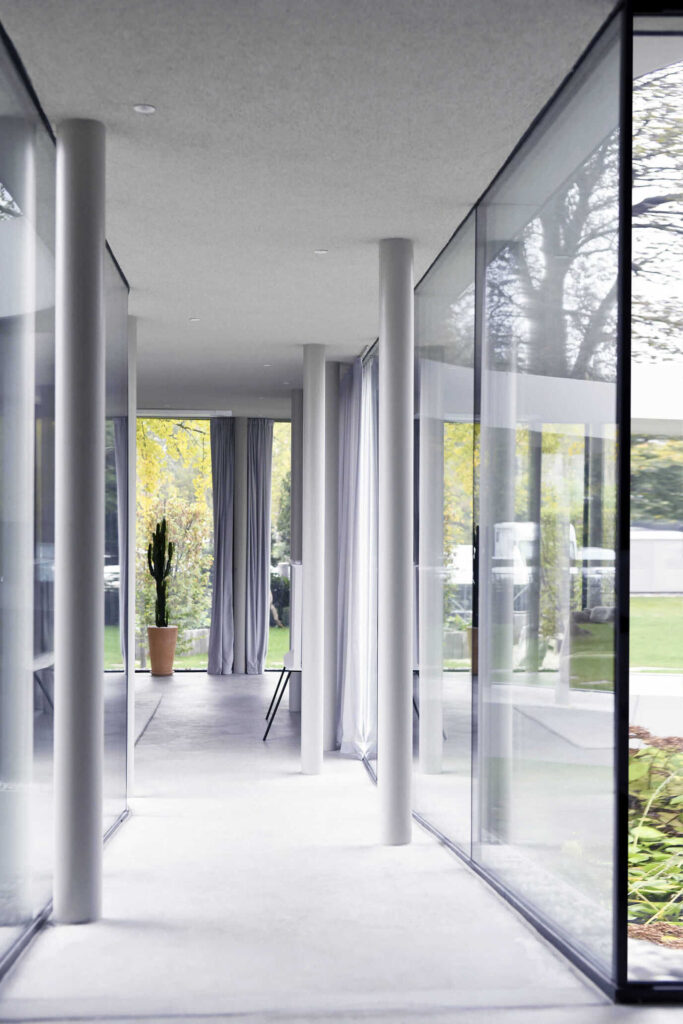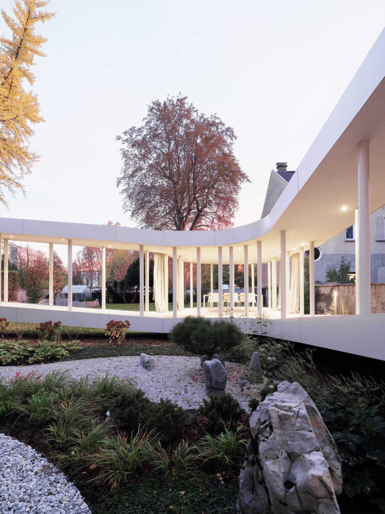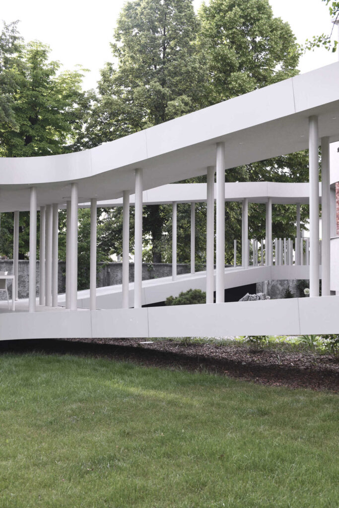 Ob krožni poti se stebriščni hodnik na dveh mestih razširi in ustvari različne prostorske situacije. V zastekljenem delu se dvignjen bivalni prostor poveže z izvorno hišo in prizidkom. S tem ko se približa zelenici, pa se struktura povsem odpre v vrtni paviljon, ki ga definirajo zgolj stebri in zavesa.