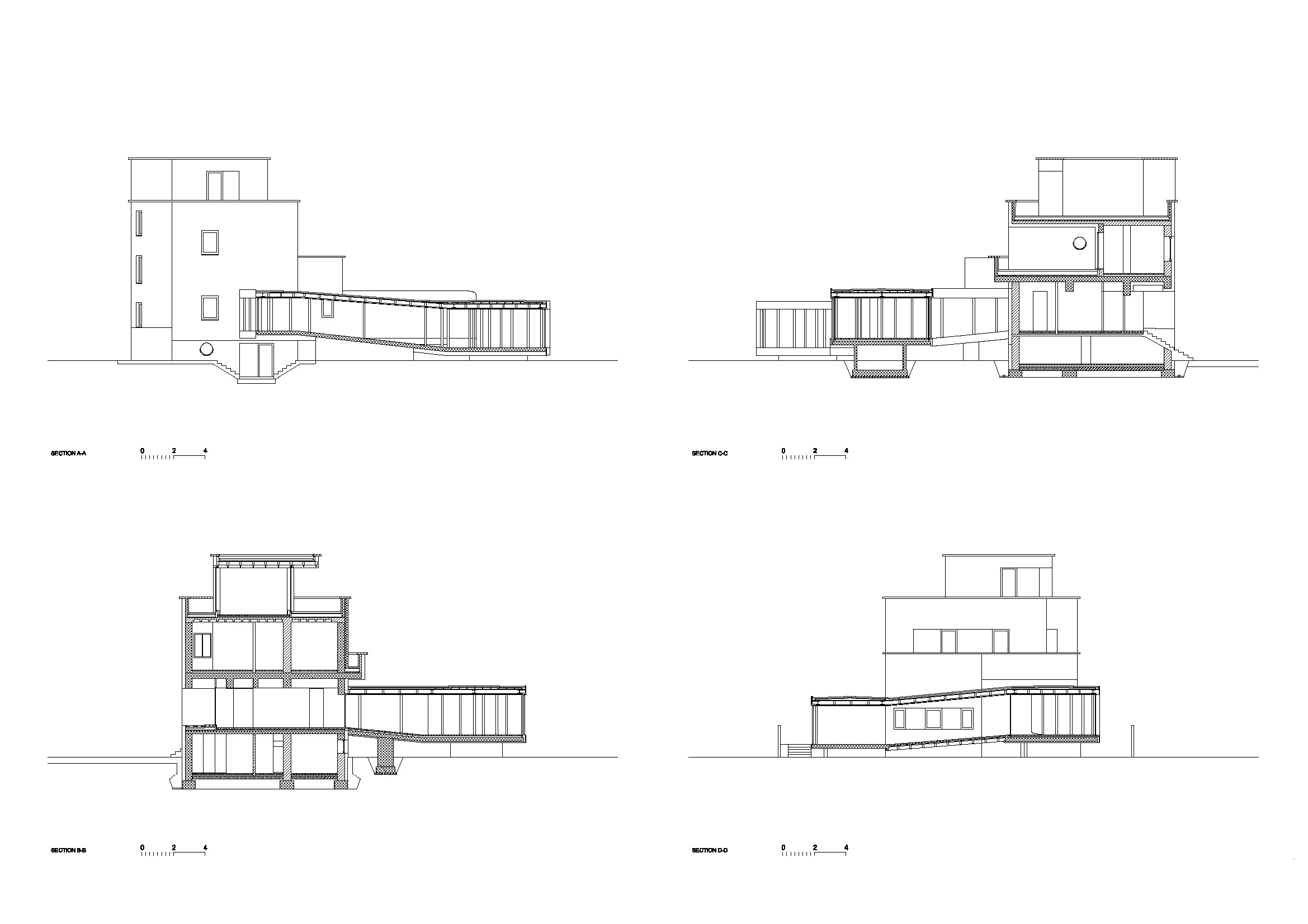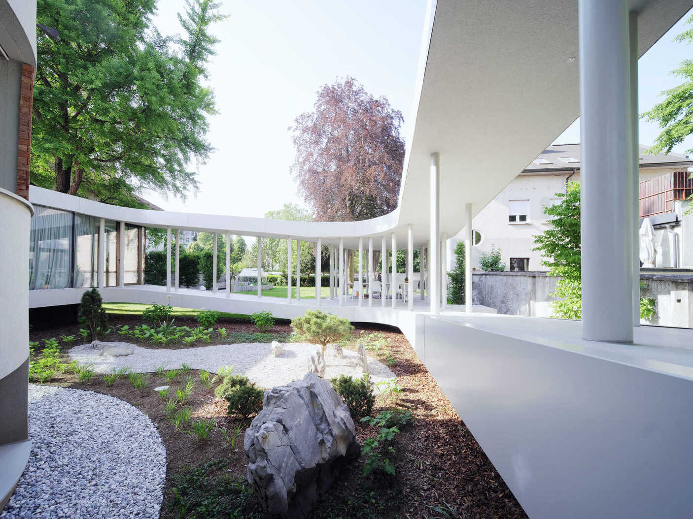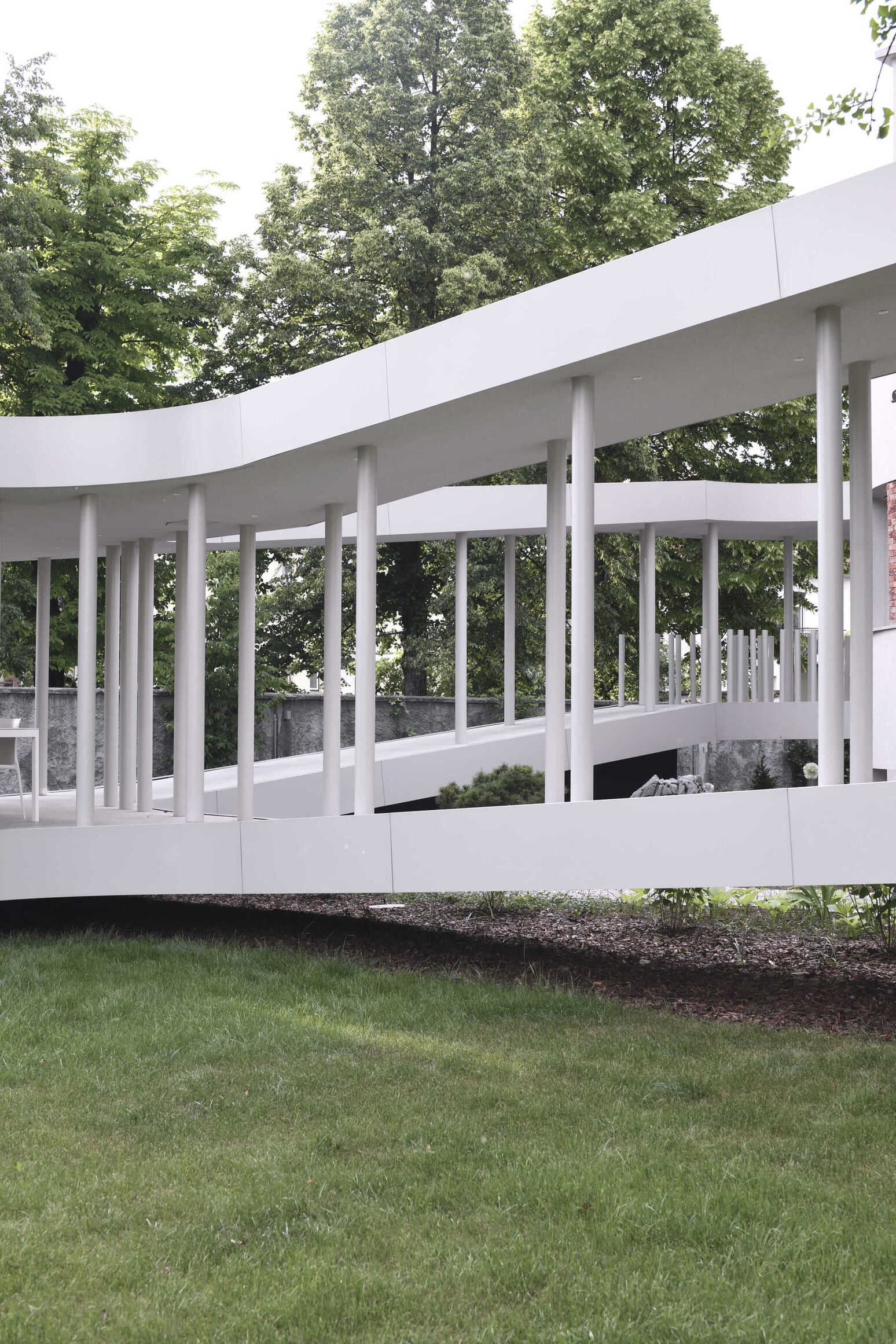 Ob krožni poti se stebriščni hodnik na dveh mestih razširi in ustvari različne prostorske situacije. V zastekljenem delu se dvignjen bivalni prostor poveže z izvorno hišo in prizidkom. S tem ko se približa zelenici, pa se struktura povsem odpre v vrtni paviljon, ki ga definirajo zgolj stebri in zavesa.