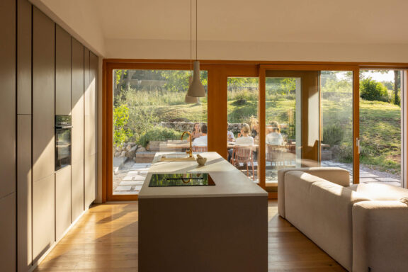 Arhitektki interier sicer opišeta kot minimalističen, saj so površine izčiščene, vrata skrita in shranjevalne površine vgrajene v stene, konzolne hrastove stopnice pa kar lebdijo v prostoru. Hkrati pa je interier daleč od minimalizma: je poln struktur, tekstur in kosov opreme, ki nam jemljejo dih. Med njimi najdemo prav posebna svetila, do tal padajoče mehke zavese ali pa potiskane kuhinjske omarice, ki sta jih prav za ta projekt razvili arhitektki.
