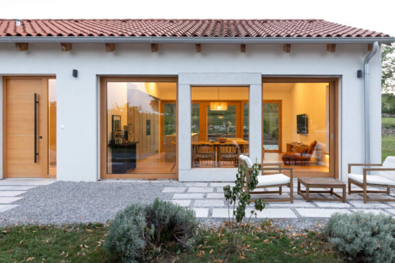 Hiša z notranjima atrijema, ki sta jo Marjetka in Mateja Lužovec dobili v opremo v tretji gradbeni fazi, je zgrajena v pasivnem standardu po načrtih arhitektov Tadeja Glažarja, Arneja Vehovarja in Emmanuela Osei-Larteya. Znotraj te že tako presunljive ljubljanske vile sta arhitektki zasnovali sodoben interier v toplih in temnih tonih, ki jih določajo bakreni in hrastovi poudarki, tonirano steklo ter strukturiranost betona in smolnatih sten.