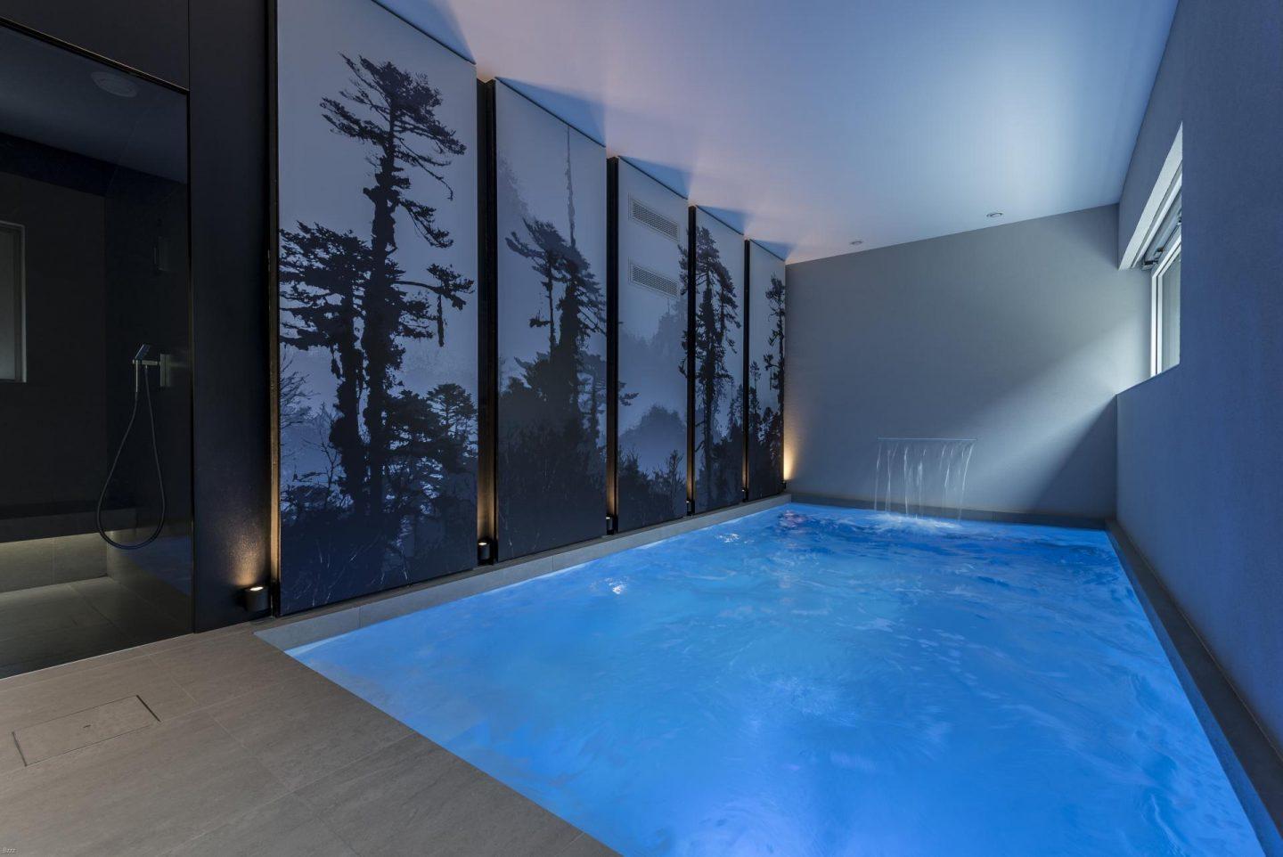 Ves bivalni del je umeščen v nadstropje. Dva velika atrija, na katera se odpirajo tako dnevni kot spalni prostori, sta zato dobrodošla povezava hiše z njeno zunanjostjo. Preprosto, a funkcionalno pohištvo, s katerim sta opremljena, nudi prostor za počitek in užitek v čudovitem razgledu na okoliške strehe. Užitkarstvo pa se ne zaključi tu: za vsesplošno dobro počutje v tej bogati hiši je poskrbljeno tudi z velikim notranjim bazenom, savno in manjšim fitnesom v pritličju objekta.