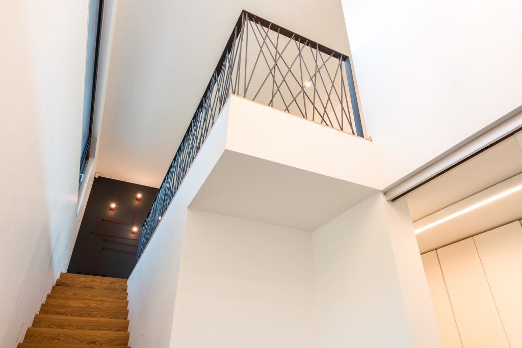 Ko torej družina prispe domov, v hišo vstopi še na ravni ceste; a odprto stopnišče z umetelno oblikovano železno ograjo obiskovalca takoj popelje v zgornjo etažo, položeno na družinski vrt. Dnevno-bivalni prostor je zasnovan odprto – ne le, da se v njem prepletajo kuhinjski, jedilni in počivalni kotiček, pač pa se preko drsnih panoramskih sten odpre navzven, na bivalno teraso in na zelenico.