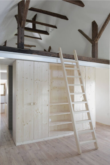 Skoraj nič-energijska hiša je sestavljena iz dveh volumnov: na tistega, ki previsi, in tistega, ki je položen na teren. Prvi, spalnični, ima ravno streho in se odpira tako na bližnji gozdni rob (otroški sobi in kopalnica) kot na vrt (spalnica). Drugi, bivalni del, pa je zasnovan v čisto drugačnem duhu – kot atrijska dvokapna hiša, ki se po celotni vzdolžni stranici povezuje z bivalnim vrtom. Ta dvojnost volumnov je zelo lepo izražena ne le z obliko strehe, pač pa tudi z barvo fasade in konstrukcijsko logiko obeh delov.