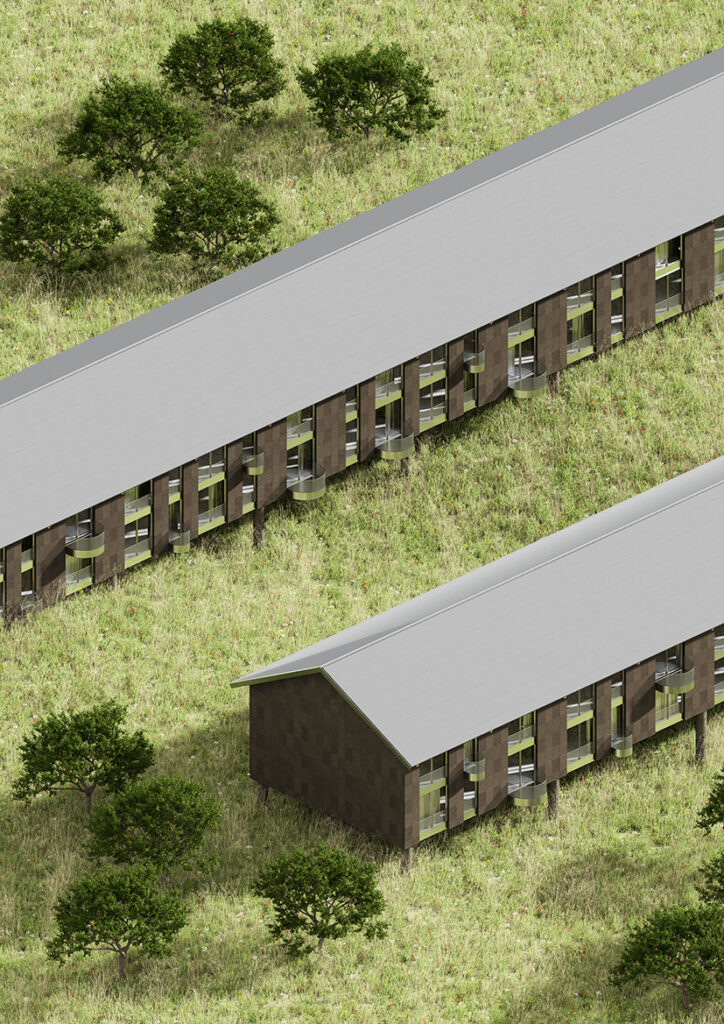 Študentski projekt Dve dolgi hiši izstopa s premišljenim raziskovanjem časa kot temeljnega orodja oblikovanja. Avtorica obravnava degradirano postindustrijsko območje Jesenic, ki ga razume kot plastovito krajino spomina, zavezano preobrazbi. Zemlja kot gradnik, ponovna raba materialov in postopno preoblikovanje okolice so izhodišča, ki se nizajo v večfazni strategiji.