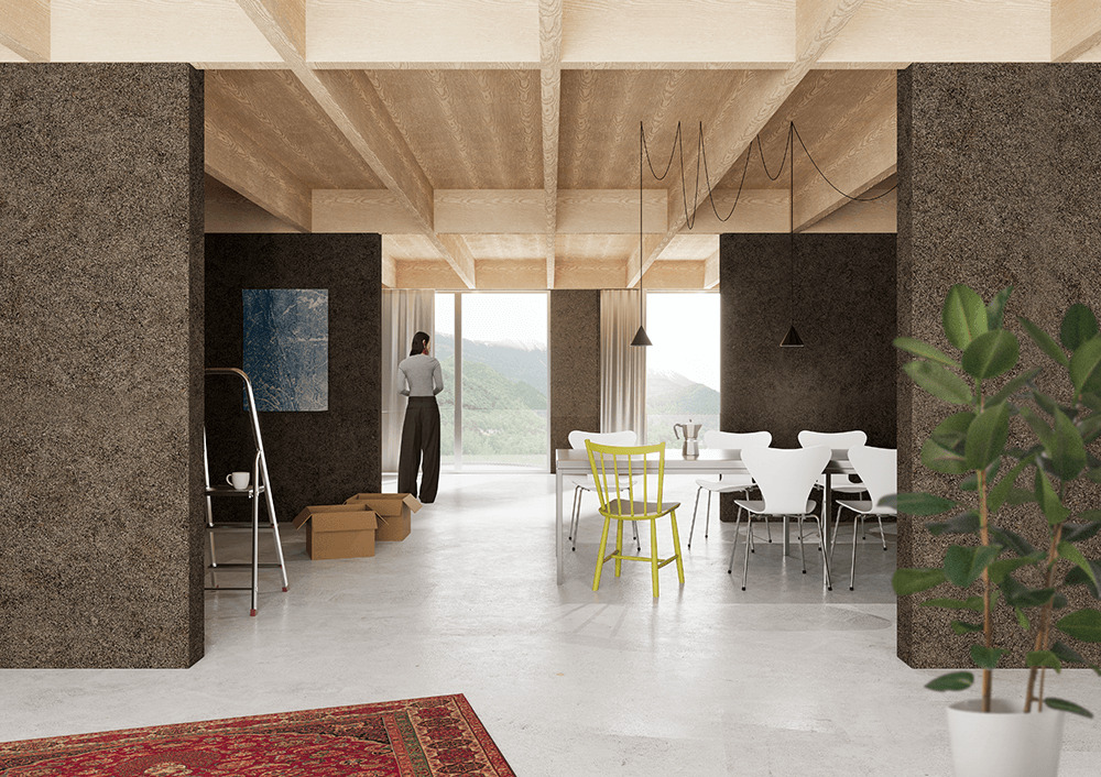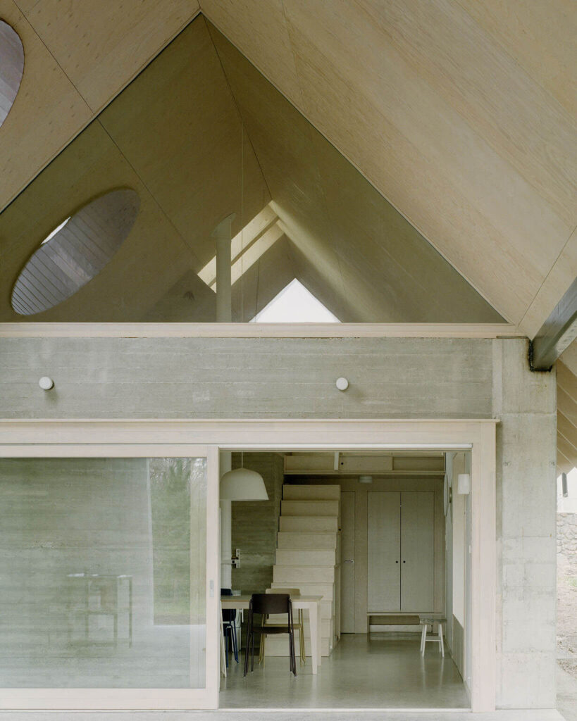 Novi betonski zidovi, ki ovijajo staro kamnito steno propadajoče kamnite hiške so zasnovani tako, da v materialnosti odmevajo stare utrjene stene z vidnimi ostanki kamnitih plasti. Kot odtis preteklosti vzpostavljajo kontinuiteto kraja, ne da bi zapadli v patetično posnemanje – namesto tega subtilno prevedejo tradicijo v sodobno govorico. Arhitektura odpira mehke prehode med notranjostjo in zunanjostjo, med zasebnim zavetjem in širšo vaško krajino. Prostor se razpira počasi, premišljeno, kot tiha spremljava vsakdanjega življenja.