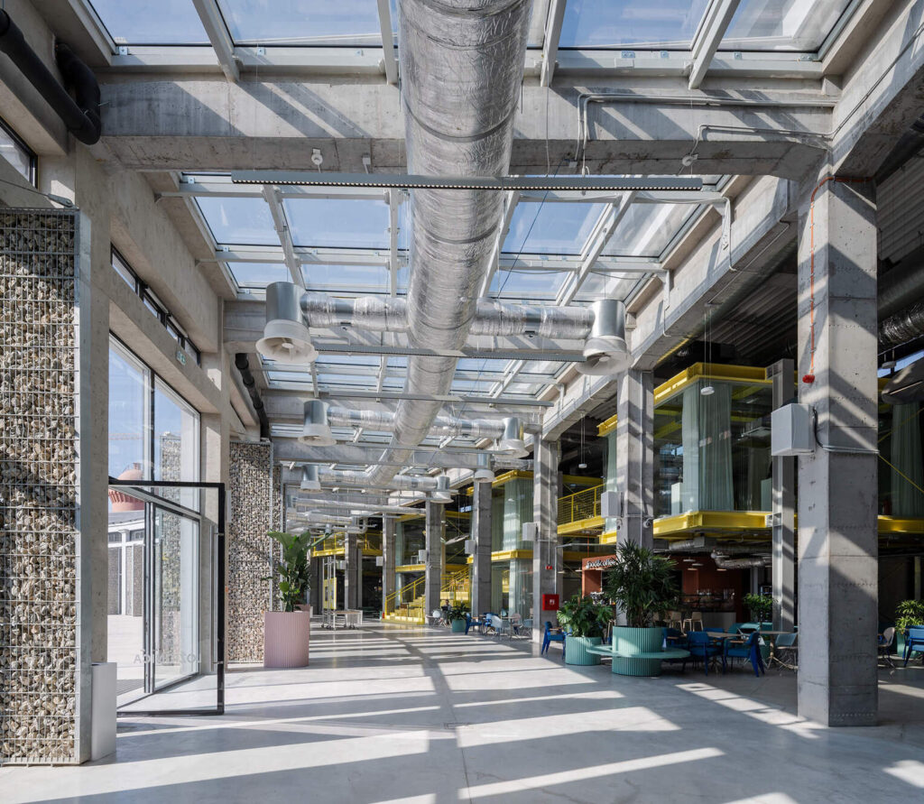 S prepletom stare strukture in novih konstrukcijskih pristopov nastane dinamično tkanje hodnikov, delovnih prostorov in odprtih površin, ki se med seboj pretakajo kot mreža idej. Surovost materialov, jasni prerezi in izčiščeni volumni vzpostavijo dialog med dediščino in sodobnostjo, ne da bi eno prevladalo nad drugim.