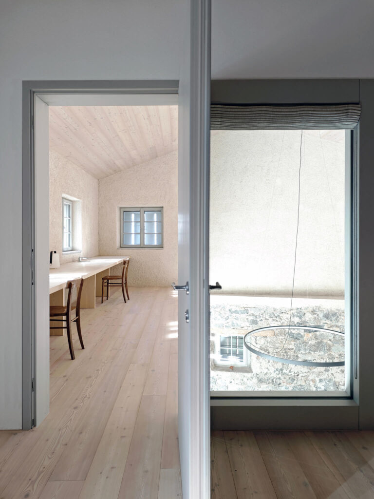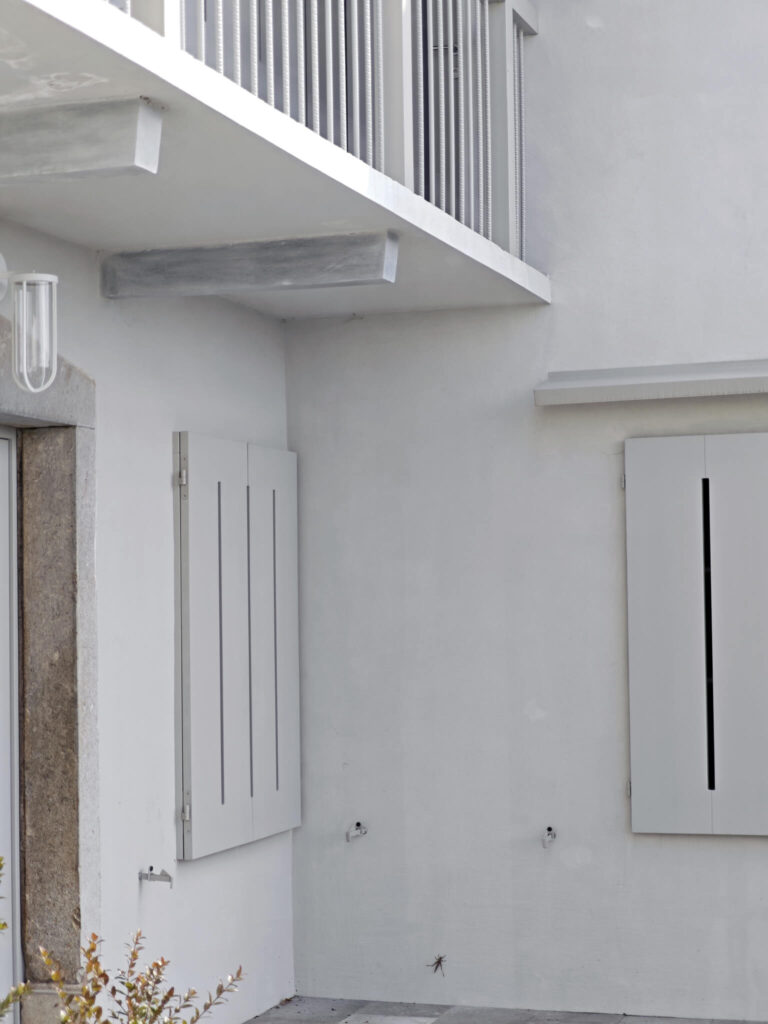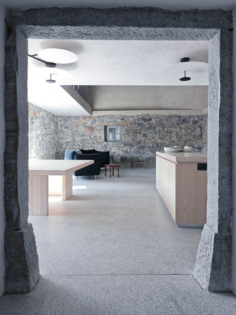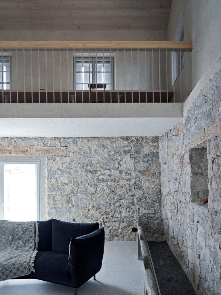Prenova poudarja materialno iskrenost domačije: grobi kamniti zidovi ostajajo vidni in kot taki pričajo o minulih dneh. Nekdanji kmetijski elementi pa so prevzeli nove vloge. Korito za krmo se transformira v element police, kmečke niše se preobrazijo v shranjevalne prostore. Dvorišče, nekoč povsem funkcionalno, se preobrazi v podaljšek dnevnega prostora – zavarovan pred burjo, a odprt ritmu vaškega življenja. Notranjost je na novo razporejena z mislijo na svetlobo in prostorsko jasnost, pri čemer udobje biva v tihem ravnovesju s težo izvornih kamnitih struktur.