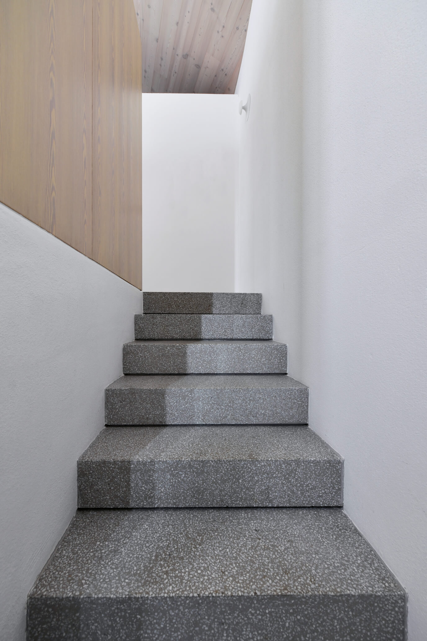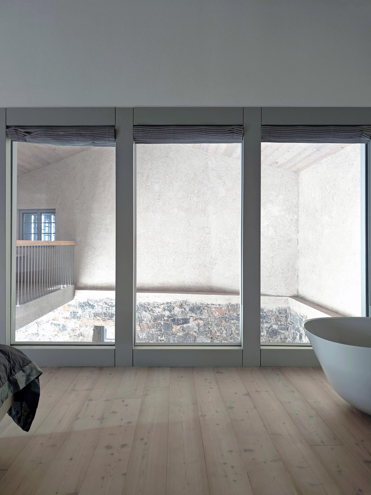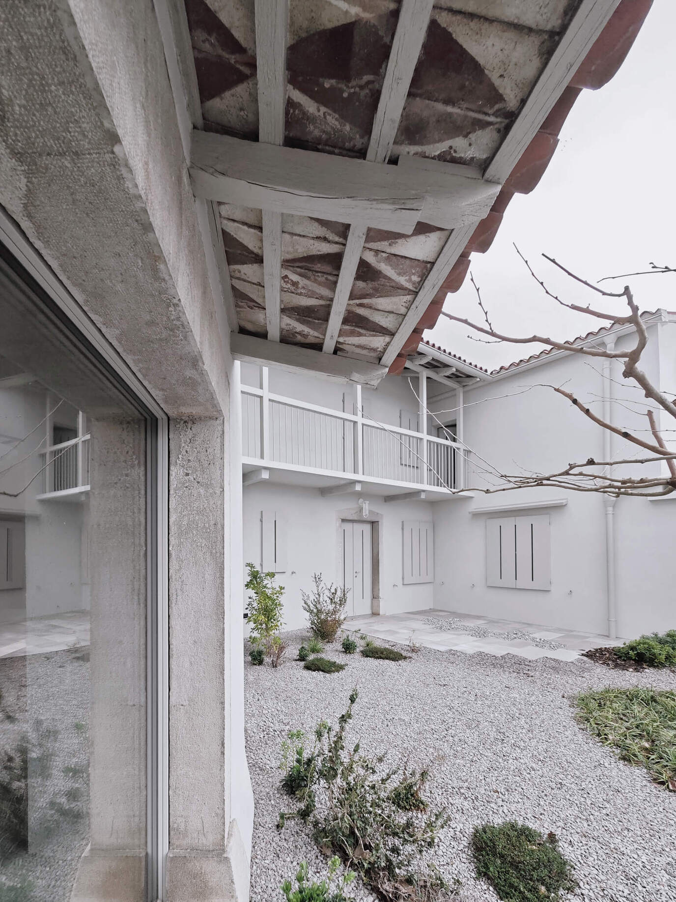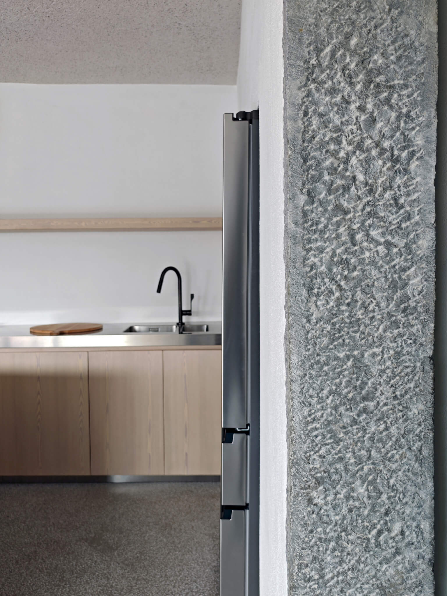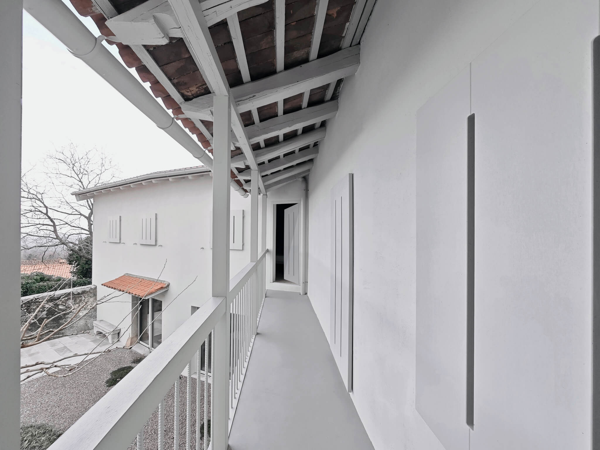 Prenova poudarja materialno iskrenost domačije: grobi kamniti zidovi ostajajo vidni in kot taki pričajo o minulih dneh. Nekdanji kmetijski elementi pa so prevzeli nove vloge. Korito za krmo se transformira v element police, kmečke niše se preobrazijo v shranjevalne prostore. Dvorišče, nekoč povsem funkcionalno, se preobrazi v podaljšek dnevnega prostora – zavarovan pred burjo, a odprt ritmu vaškega življenja. Notranjost je na novo razporejena z mislijo na svetlobo in prostorsko jasnost, pri čemer udobje biva v tihem ravnovesju s težo izvornih kamnitih struktur.