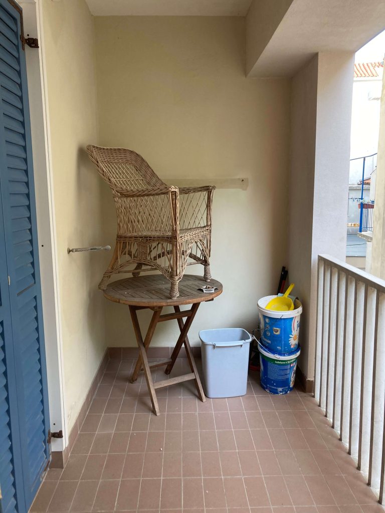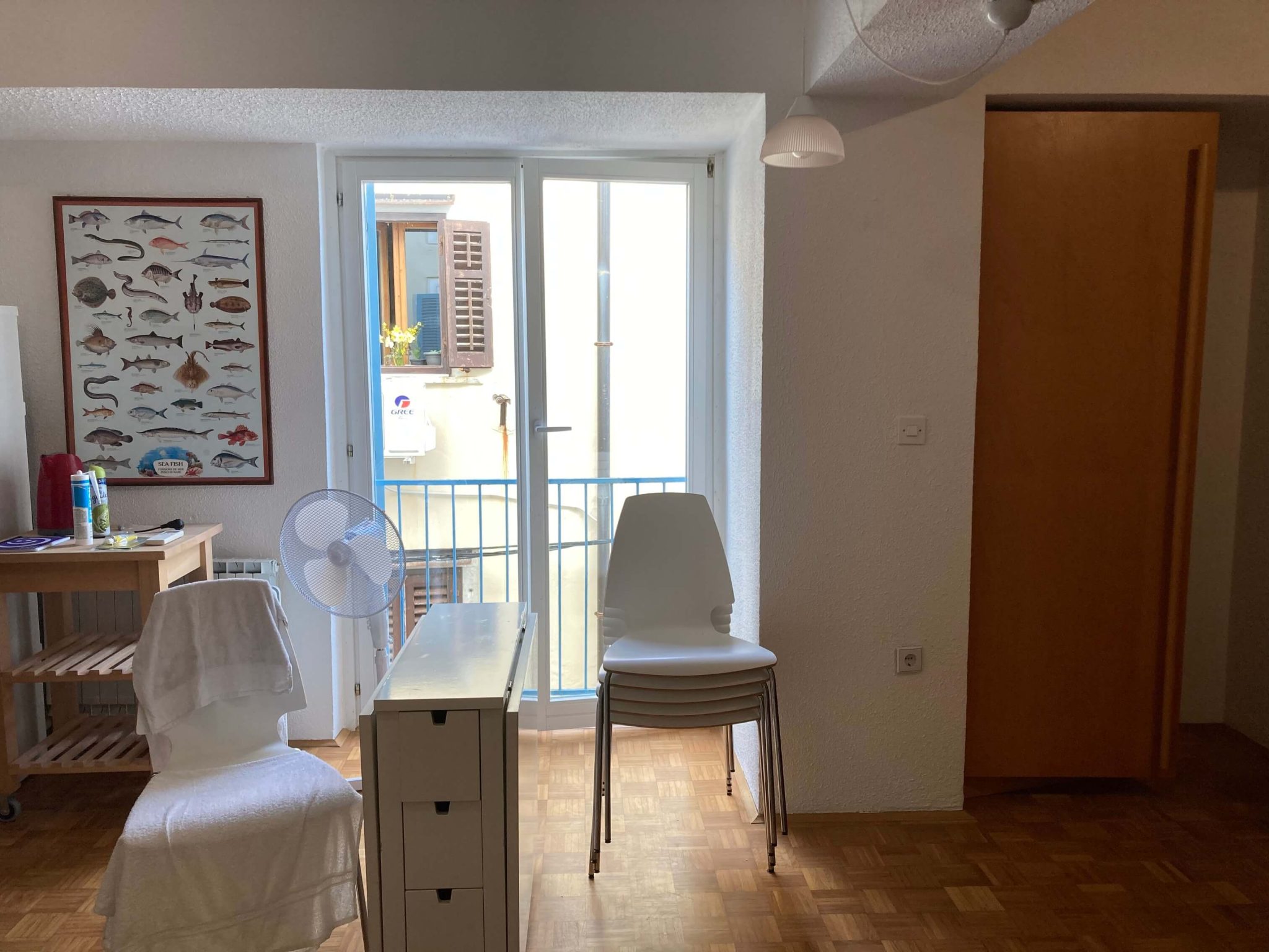 Stanovanje se nahaja tik ob morju, v novejši stavbi. Tloris stanovanja je ozek in podolgovat, z enim oknom pa se odpira proti morju, medtem ko preostala dva gledata na ulico. Prvotni tloris je bil oblikovan tako, da je bil dnevni prostor s kuhinjo umeščen za vhodnimi vrati, opremljen z manjšo mizo in zelo veliko dnevno sobo, kjer je bil tudi raztegljiv kavč. Za kuhinjo je bila kopalnica s slabo razporeditvijo, poleg pa spalnica z manjšo teraso.