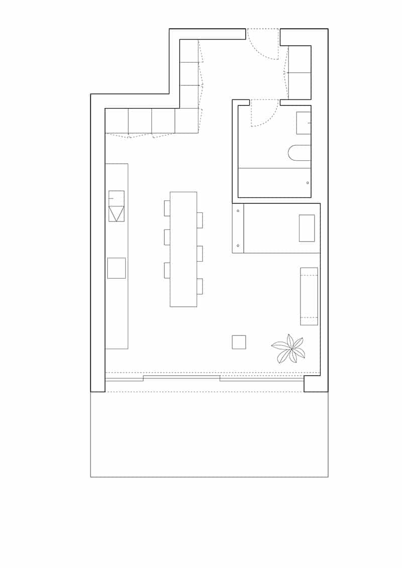 Te štiri preproste poteze – kuhinjo, mizo, regal in posteljo – sta postavili v jasno določenih vzporednih pasovih vzdolž stanovanja. “Fascinirani sva nad idejo, kako postavitev objektov v prostoru vpliva na tokove premikanja in subjektivno dojemanje prostorskih meja,” povesta o svoji filozofiji dela. Gotovo je vzporedna postavitev pripomogla k temu, da se prostor navidezno podaljša vzdolž glavne smernice gibanja, skozi okno, v zunanjost.