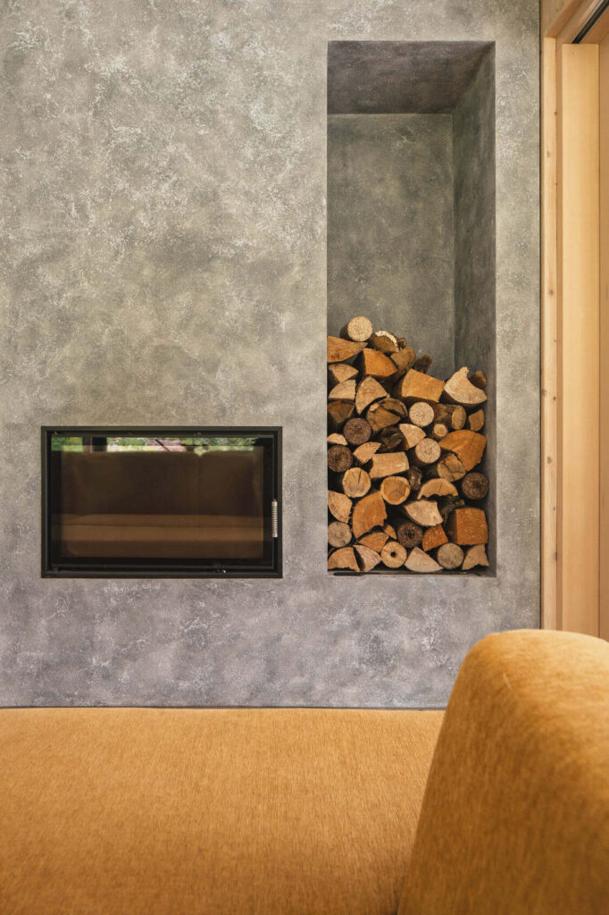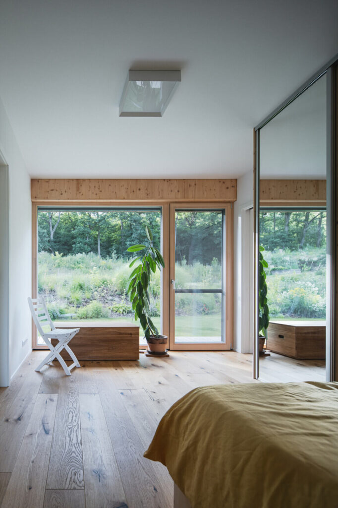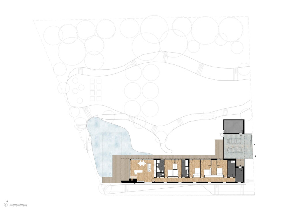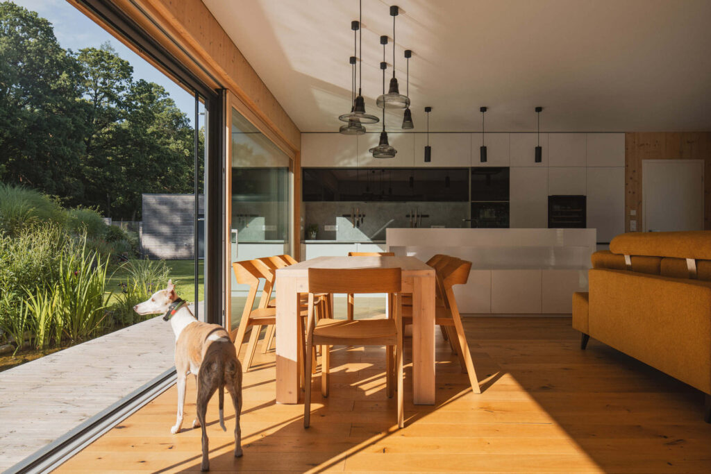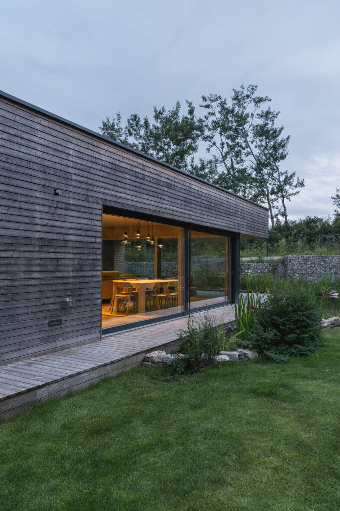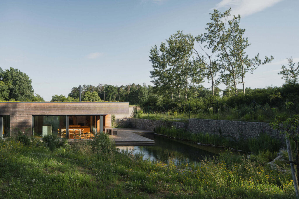 Osrednji element vrta je kopalni ribnik – pravo srce doma. Nad njim se dviguje lesena terasa, ki služi kot podaljšek bivalnega prostora. Dve veliki drsni zasteklitvi povežeta notranjost in zunanjost, tako da se dnevni prostor, terasa in vrt združijo v en sam živi organizem.